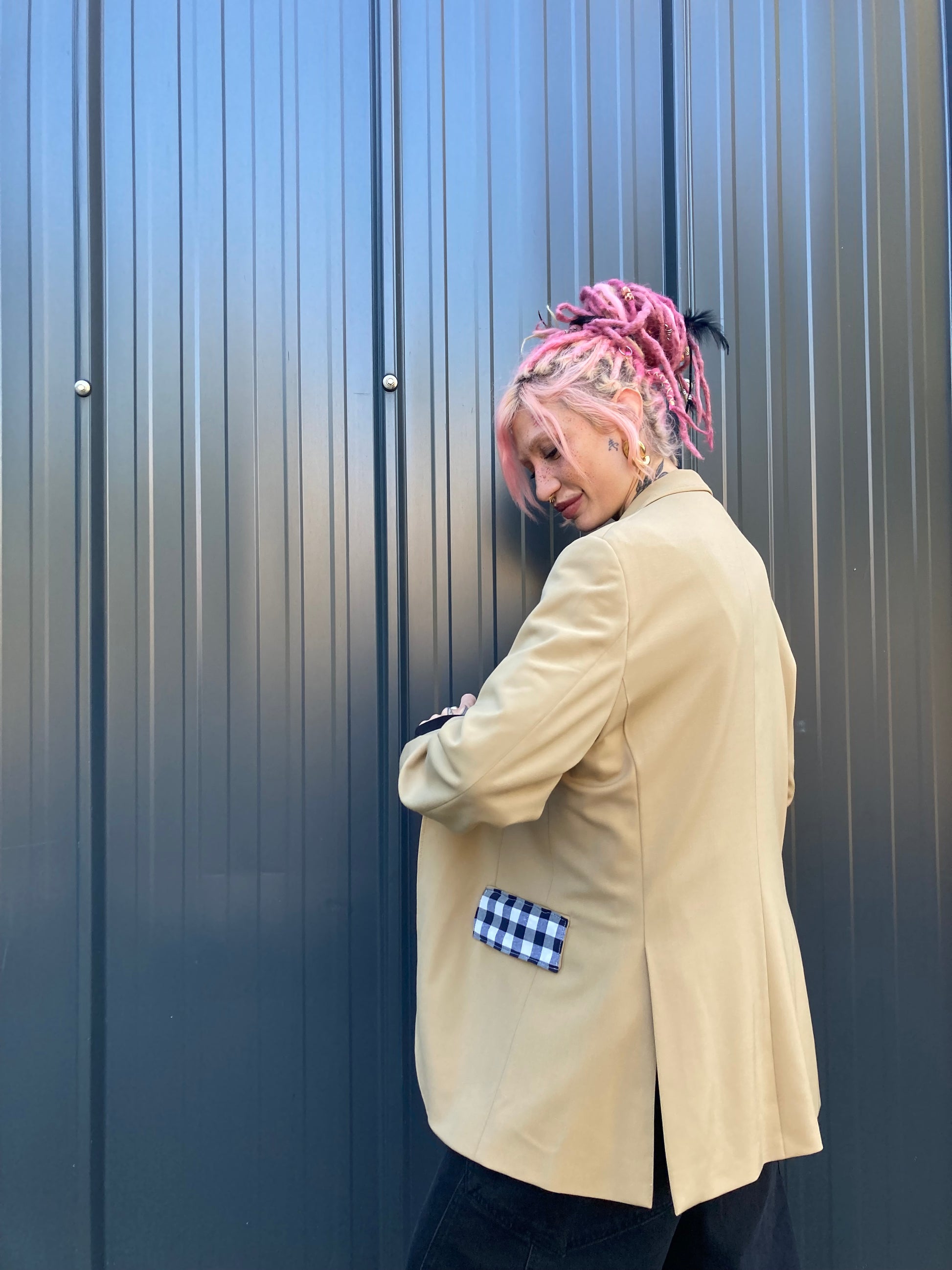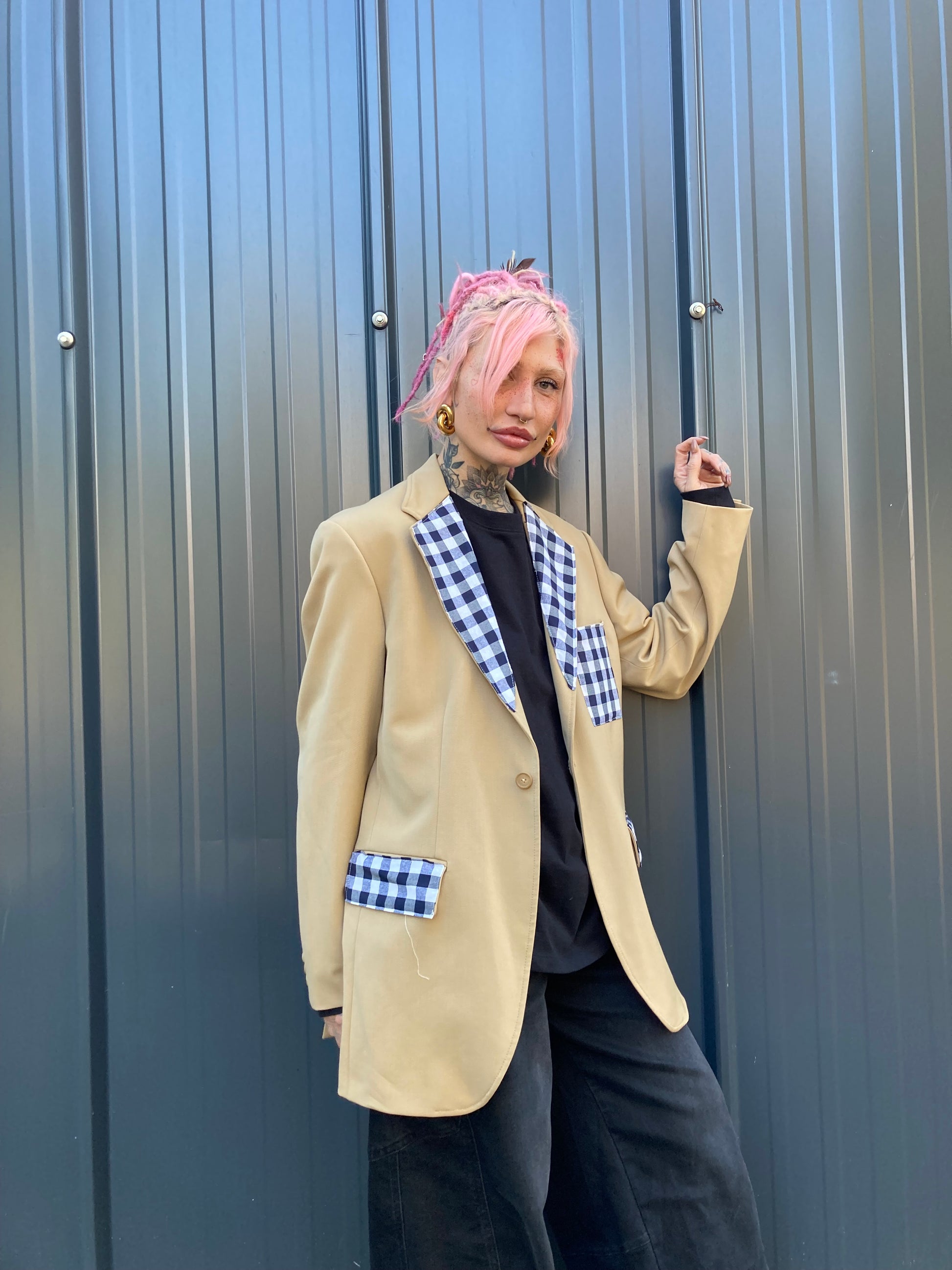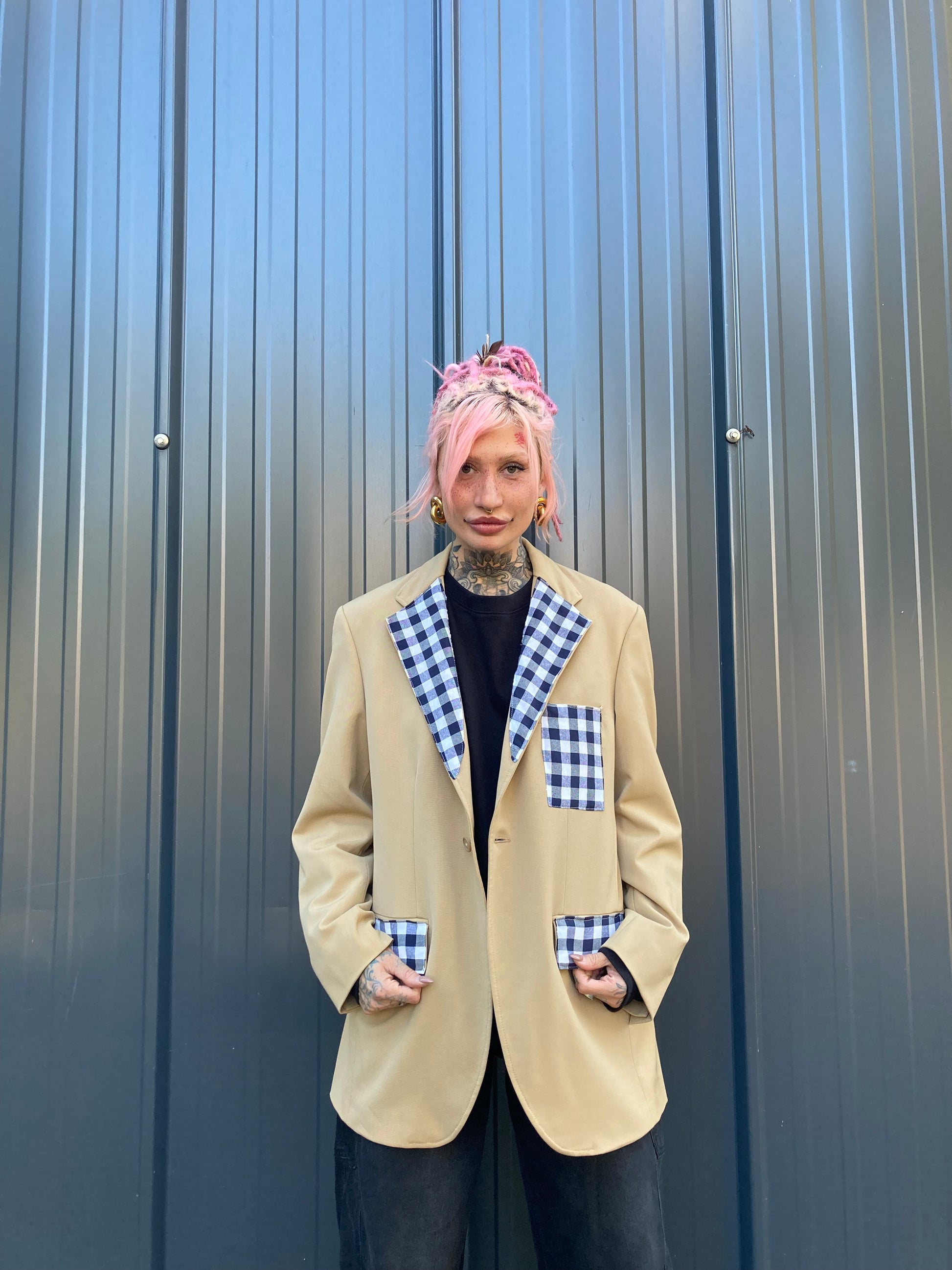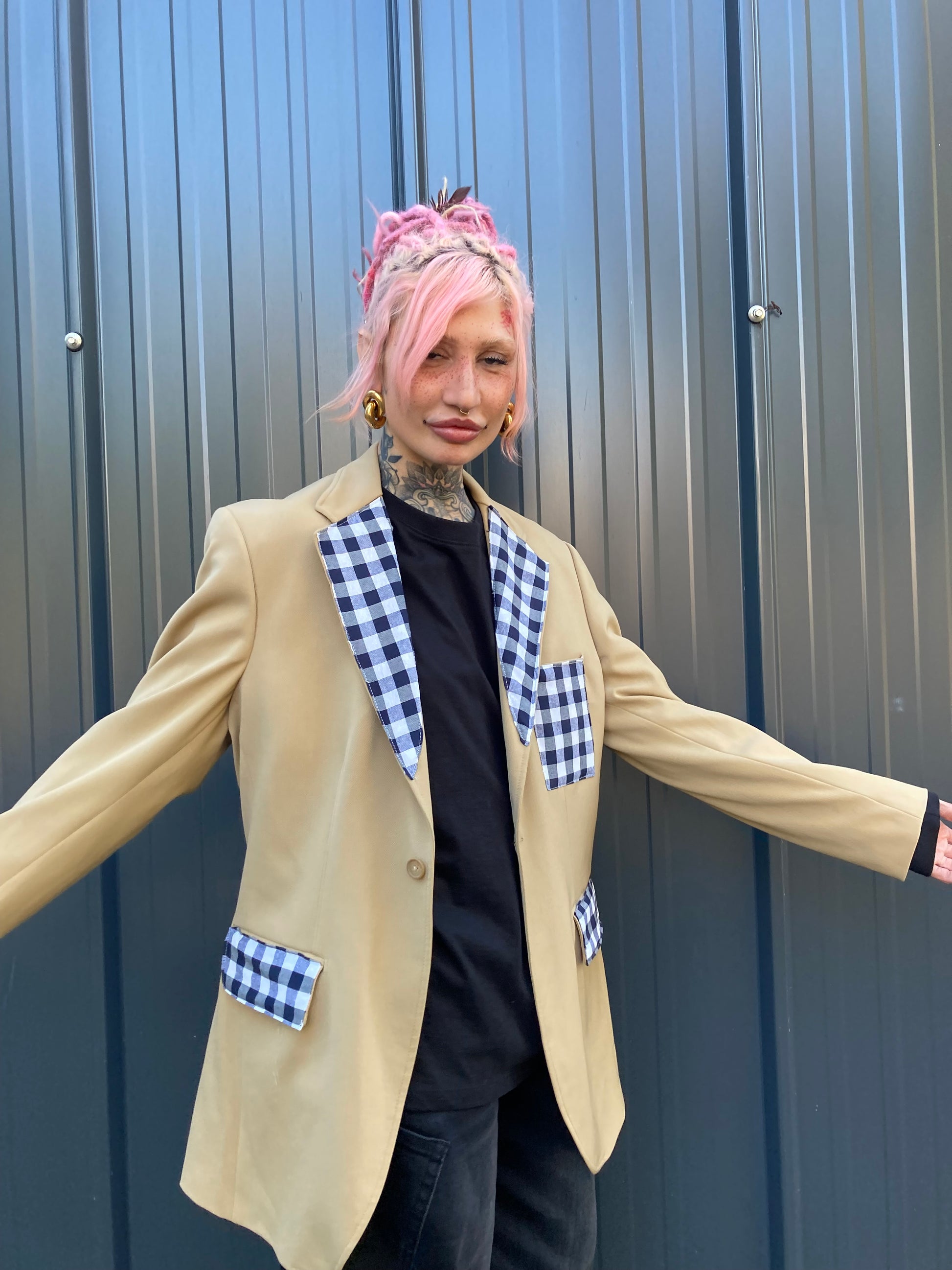 Blazer collezione macedonia color beige , patch vichy bianco /blu scuro , veste una M/L .
