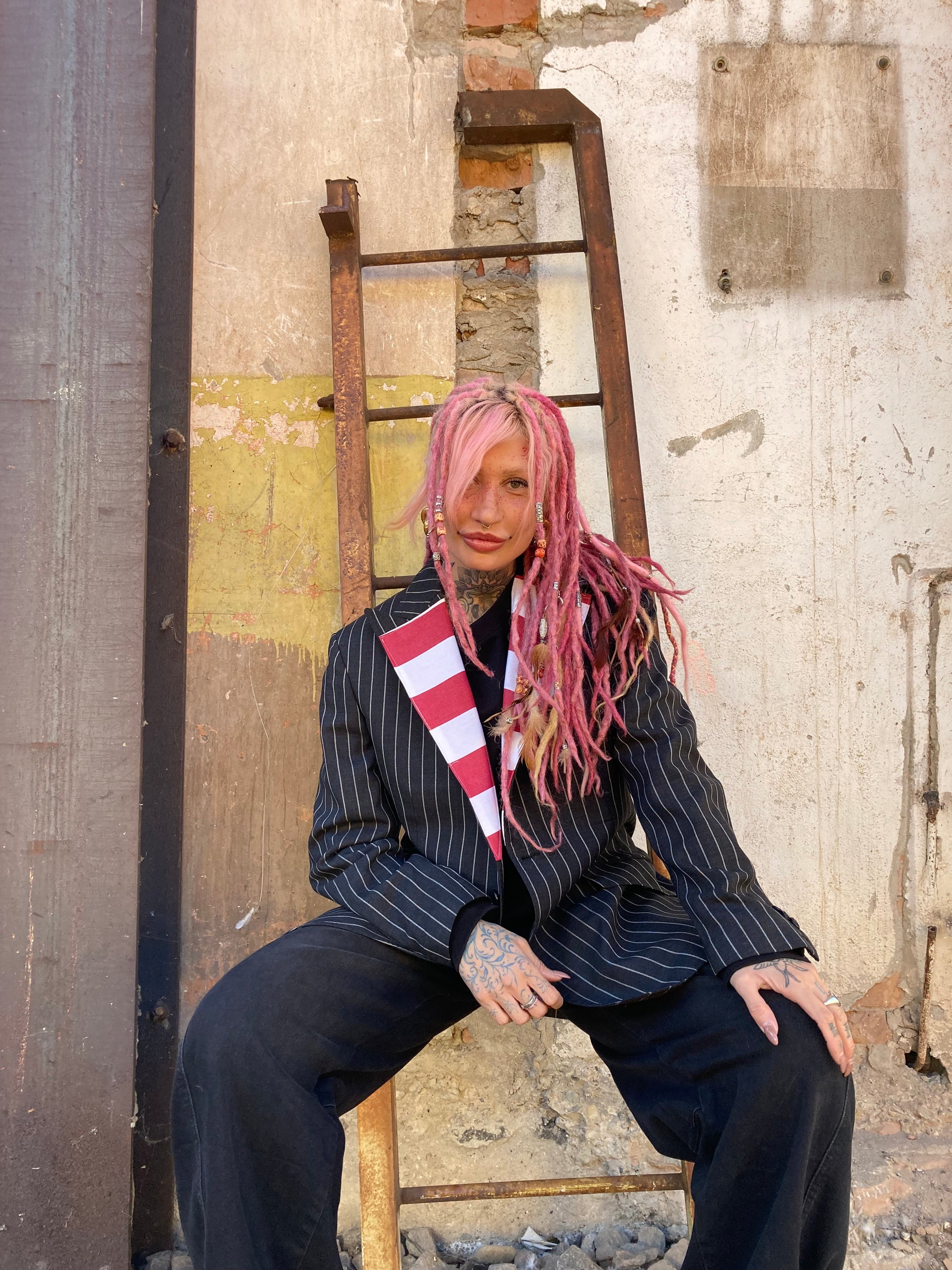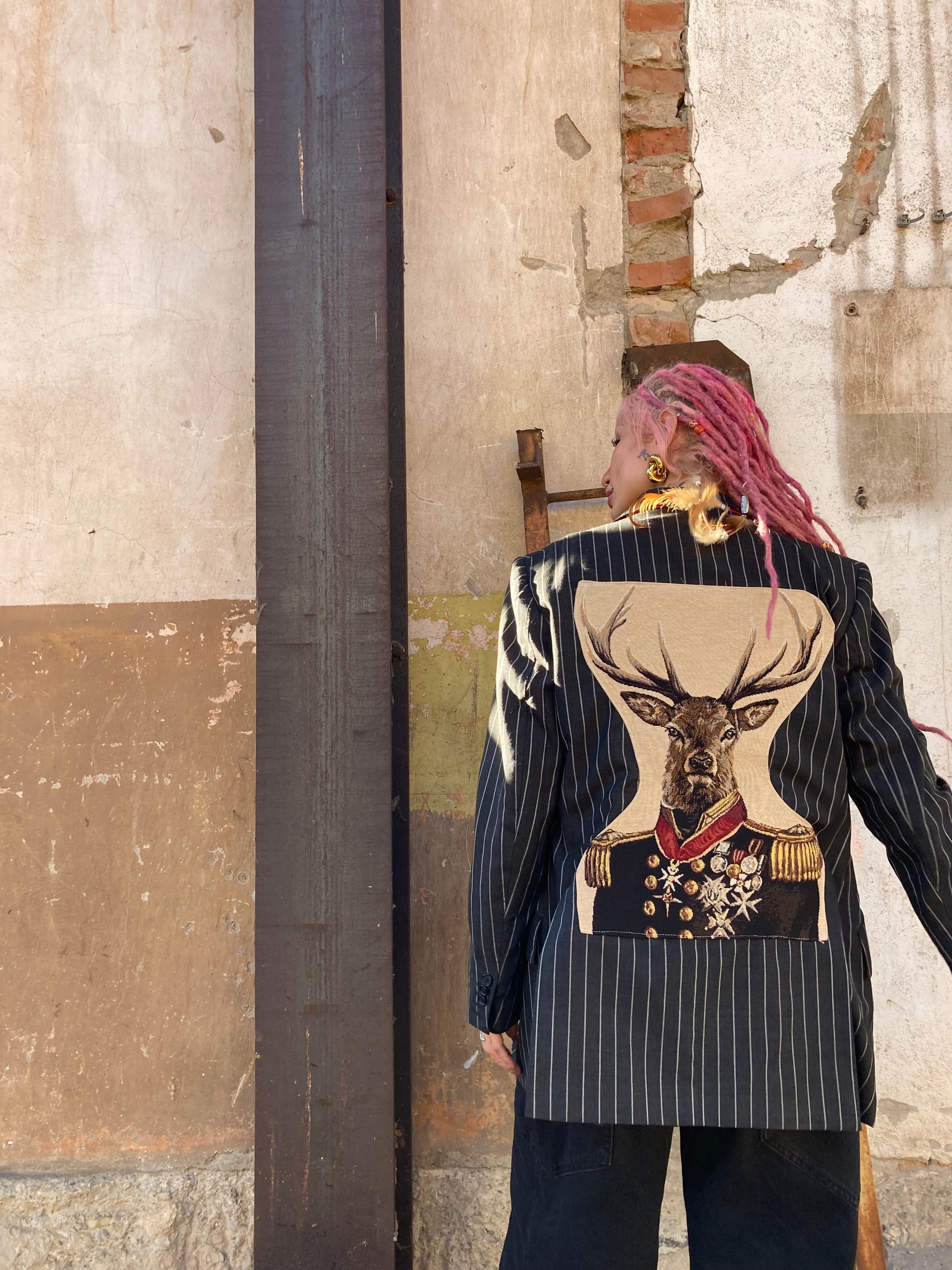 Blazer collezione Macedonia , patch rigato sul davanti , parte retro cervo in tenuta da para’ militare , riporta una tg 52 , veste una M .