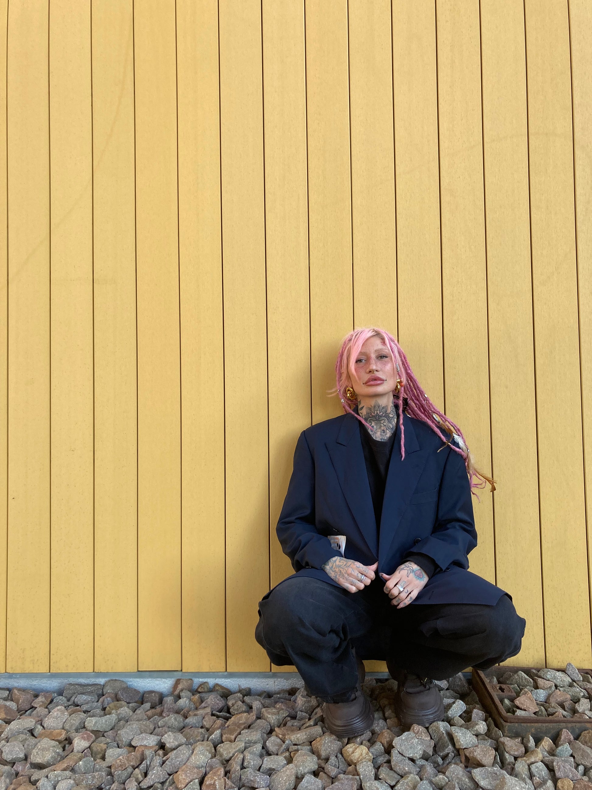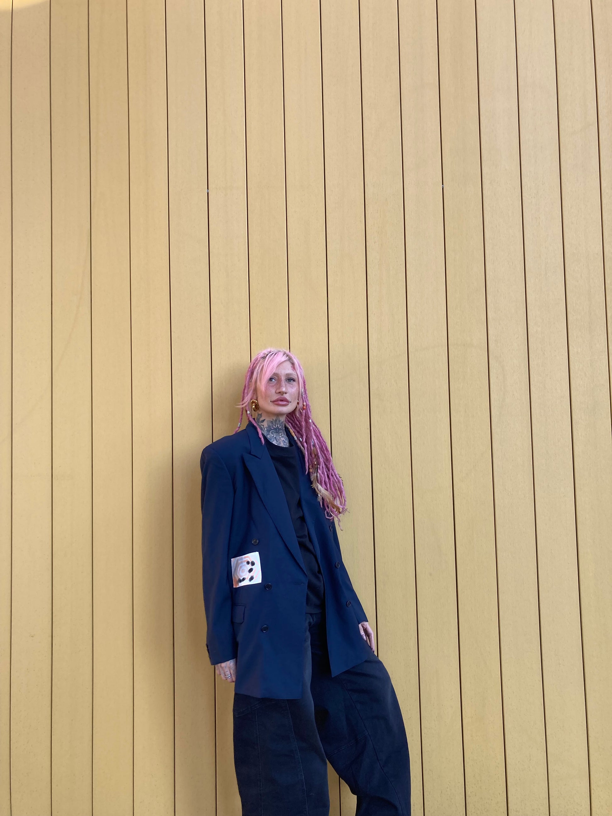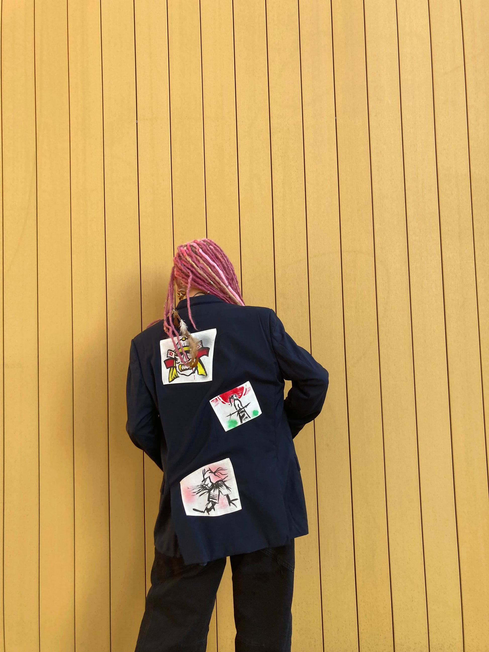 Blazer collezione macedonia doppio petto colo blue , patch in canvas con disegni dipinti a mano , trama in stile jappo , veste una L morbida .