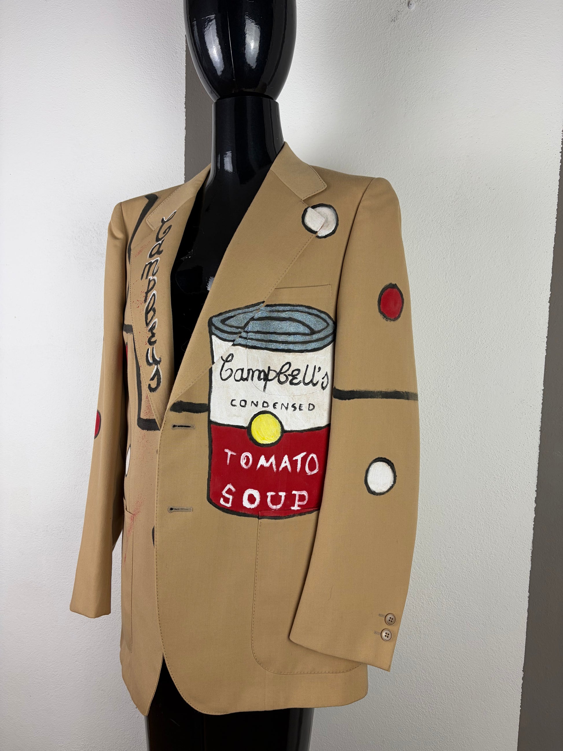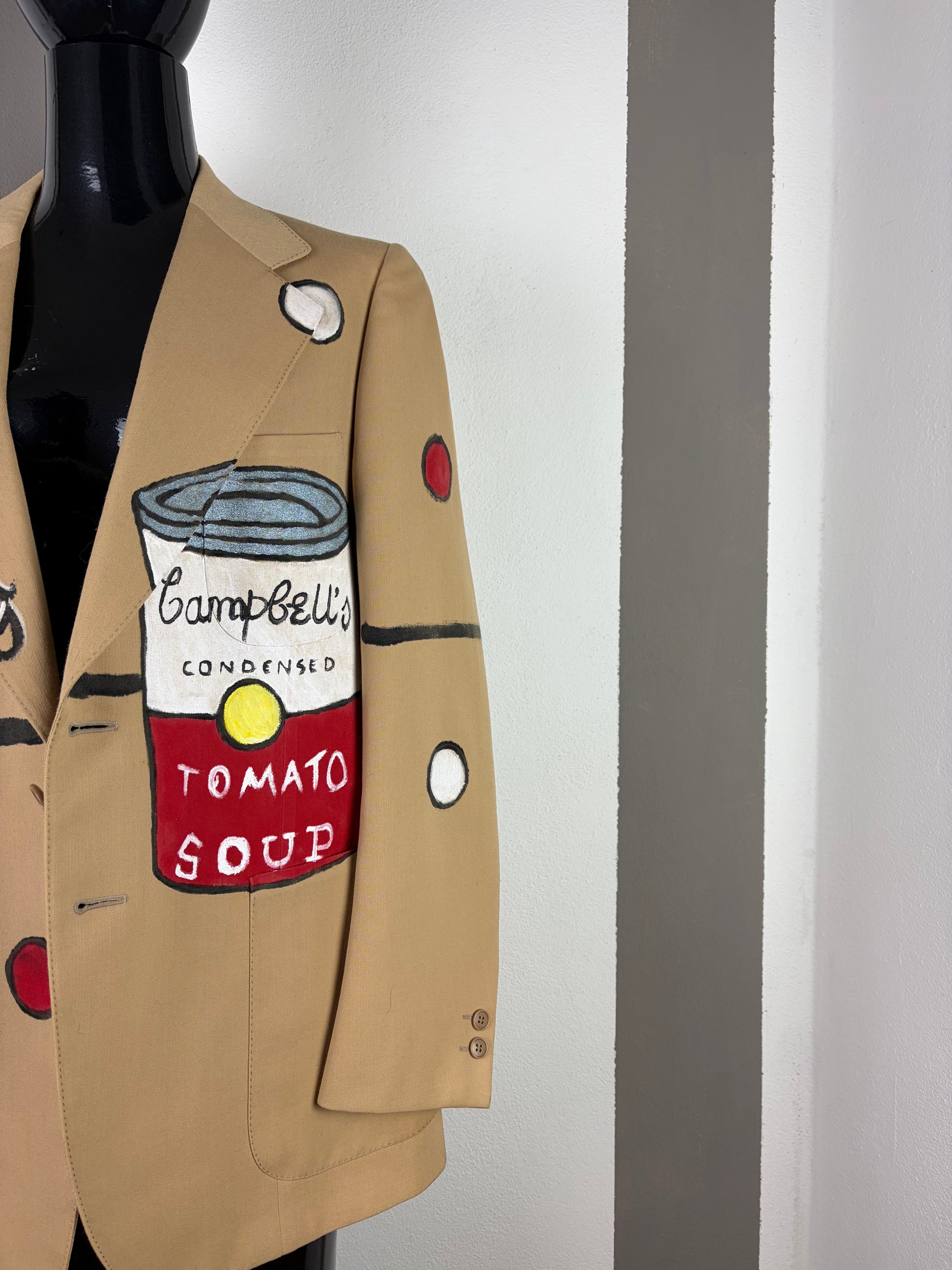 Blazer dipinto a mano con acrilico per tessuti in stile pop art , tema campbell’s soup, riporta una tg 54 ( veste da una M ad una L )