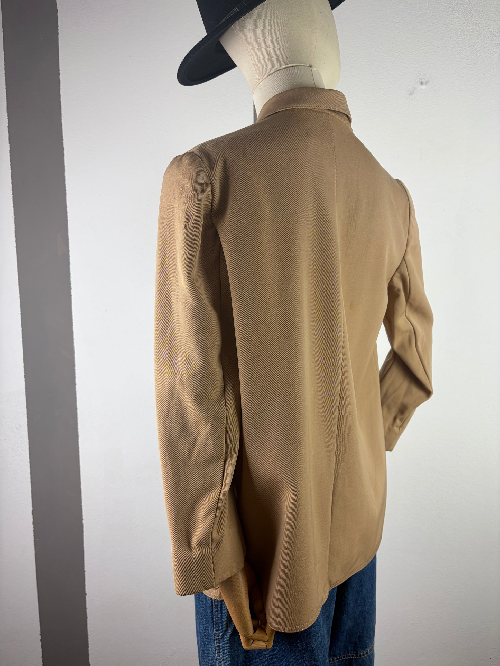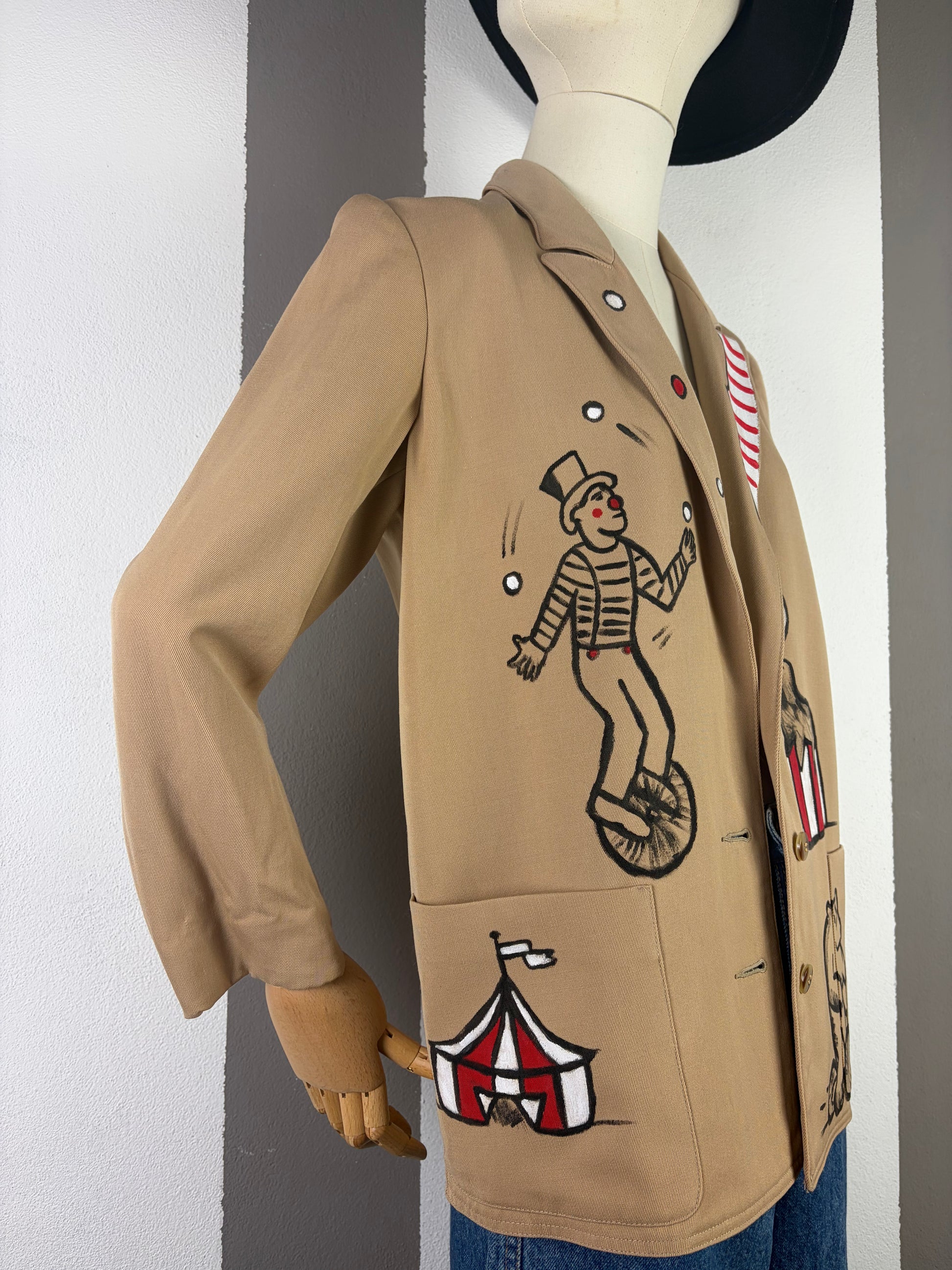 Blazer color beige dipinto a mano , tema circense , realizzato con acrilico per tessuti che resistono ai lavaggi , size 42 in lana .
