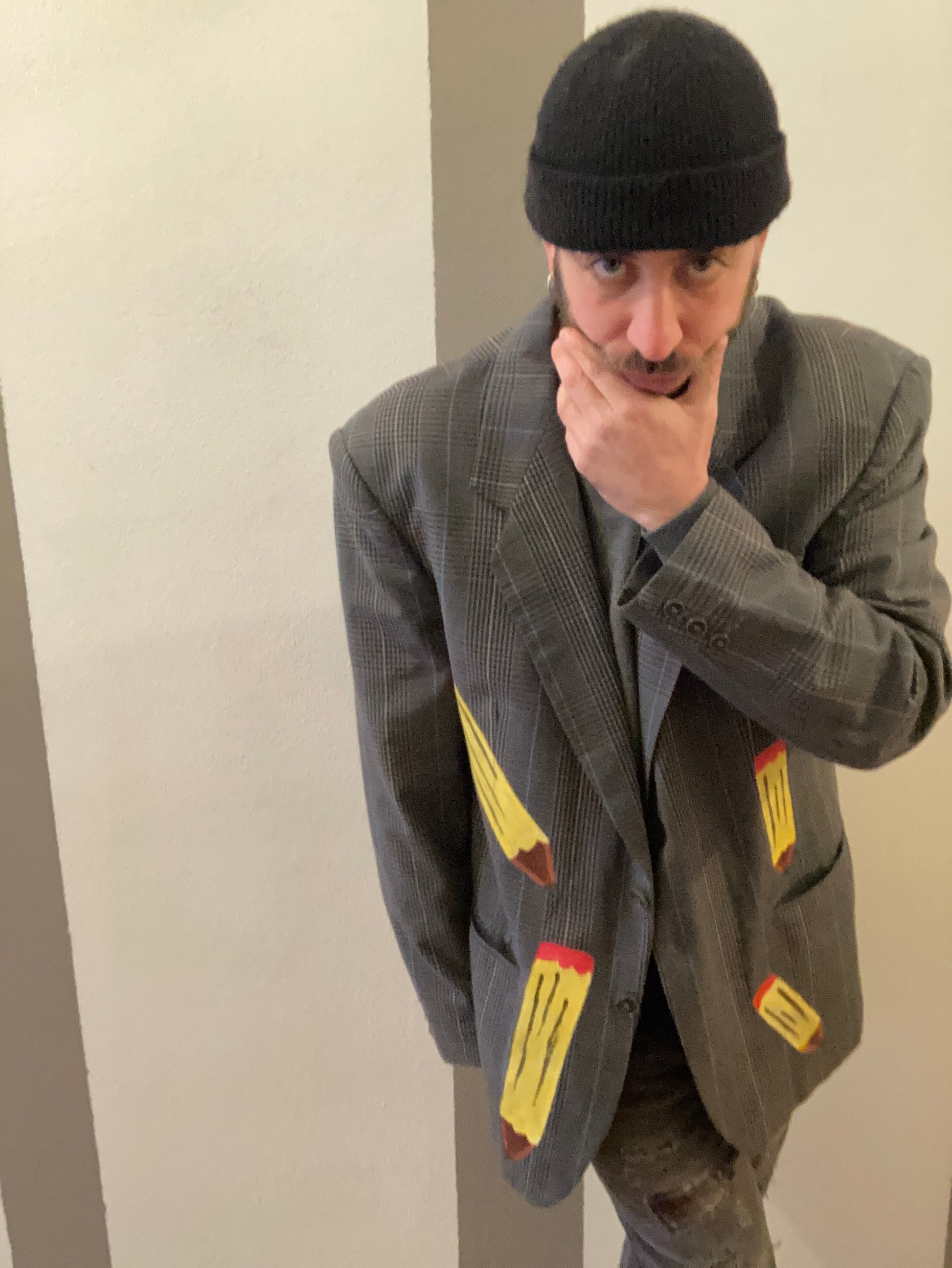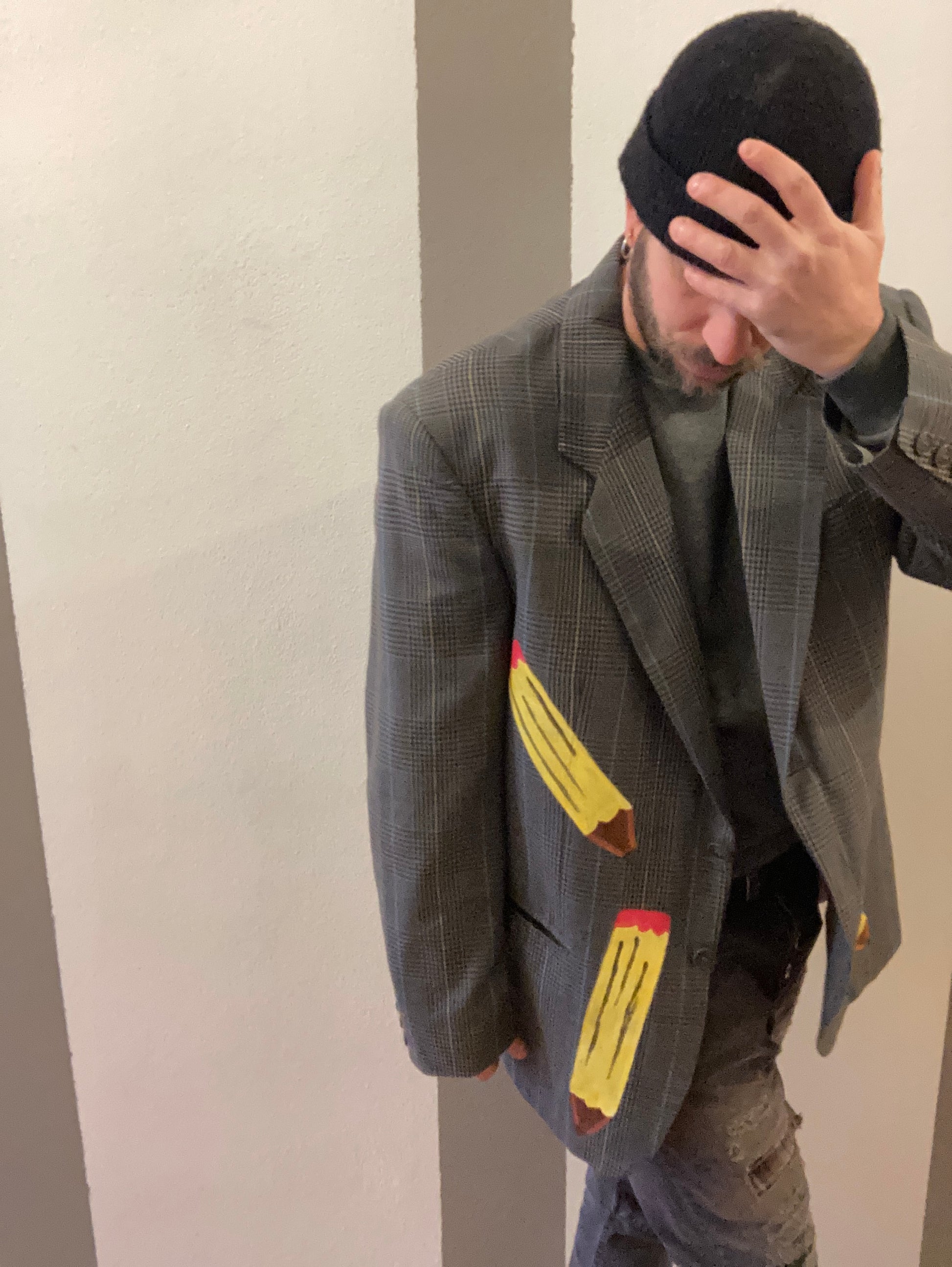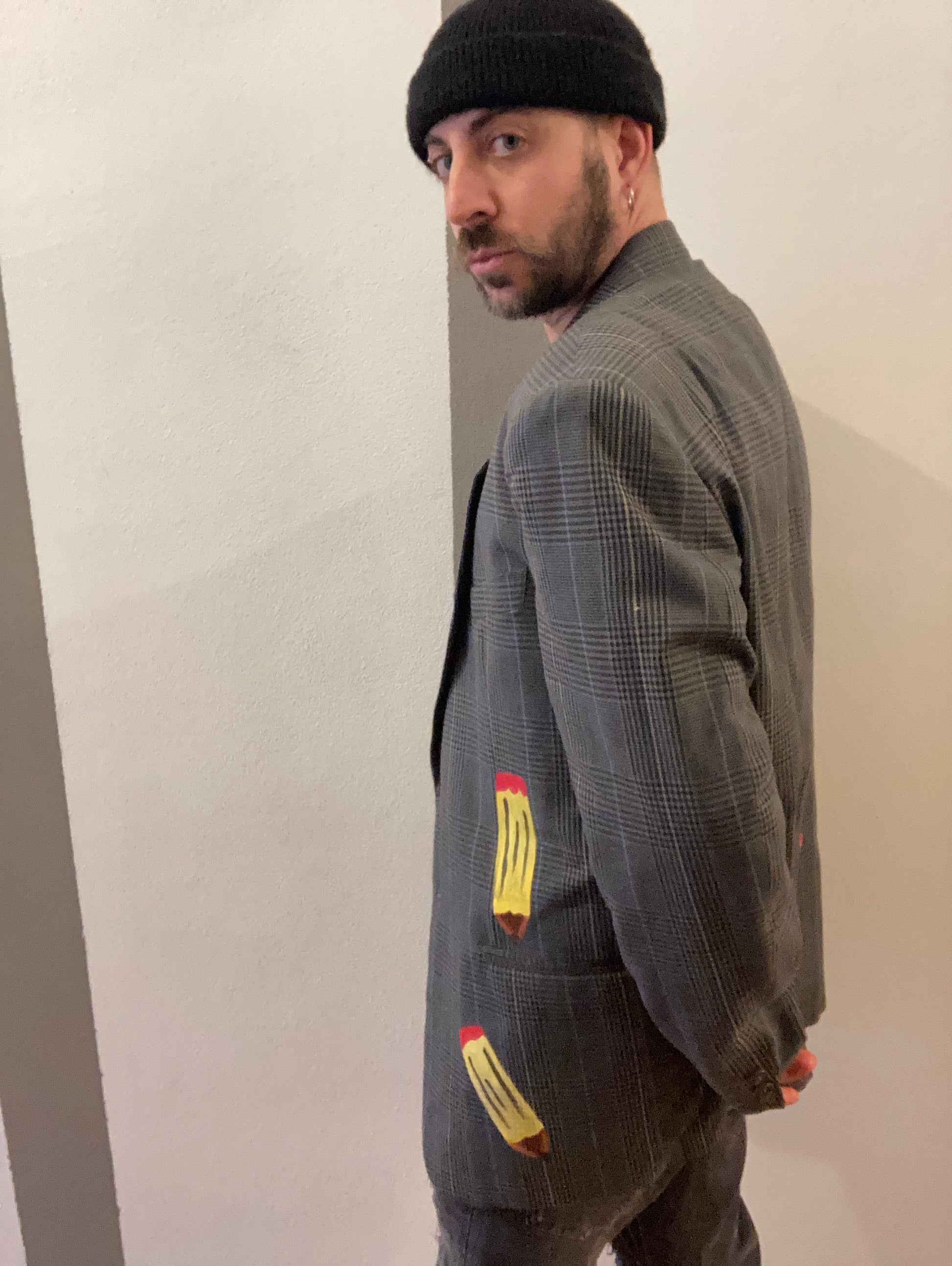 Blazer custom dipinto a mano con matite giganti in multicolor , veste una M morbida ( fresco lana ), fondo grigio con linee gialle e azzurre .