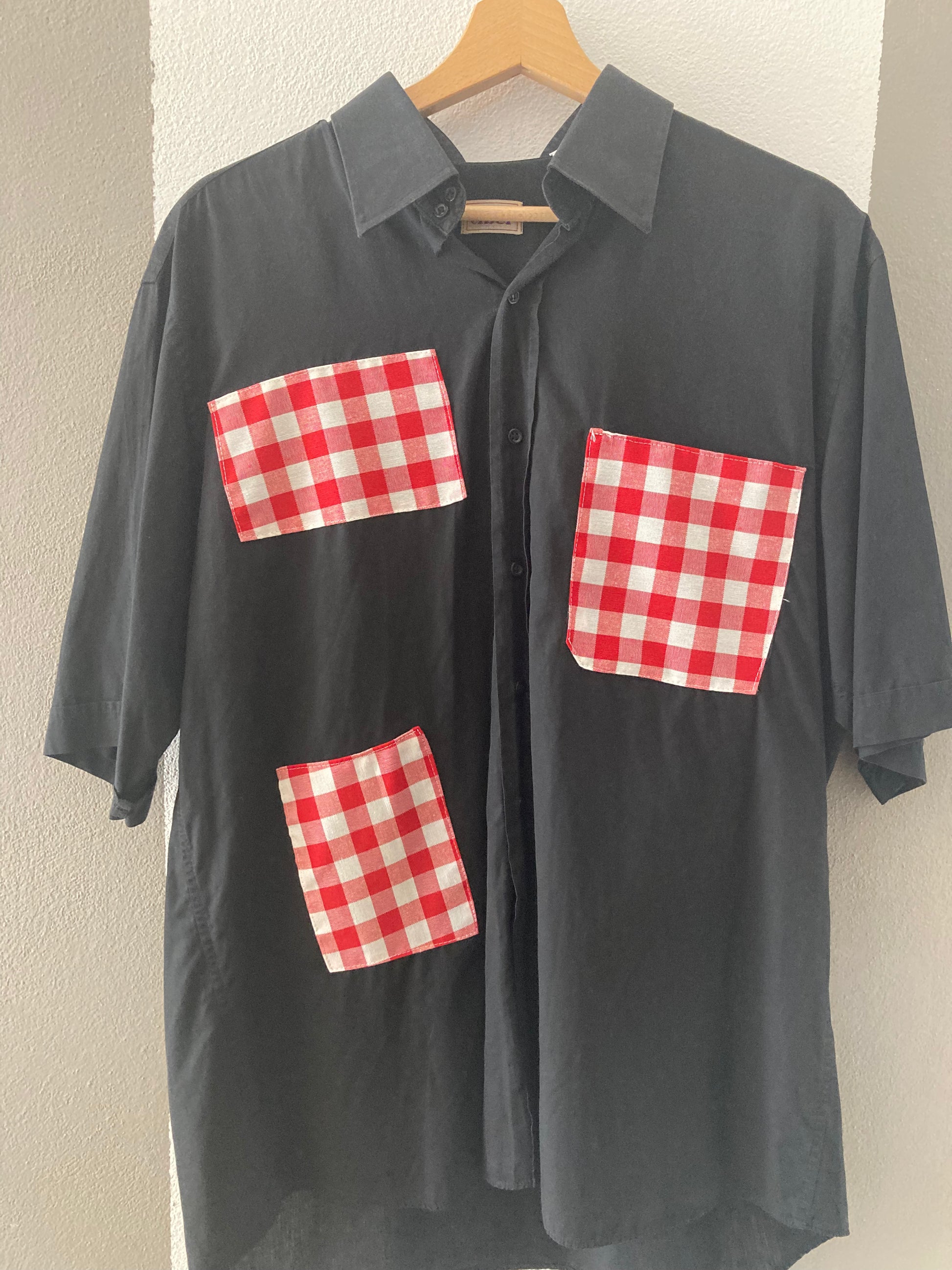Camicia custom con patch a quadri bianco/rosso , veste una L . Spalla 46cm Lunghezza 75cm Torace 59cm