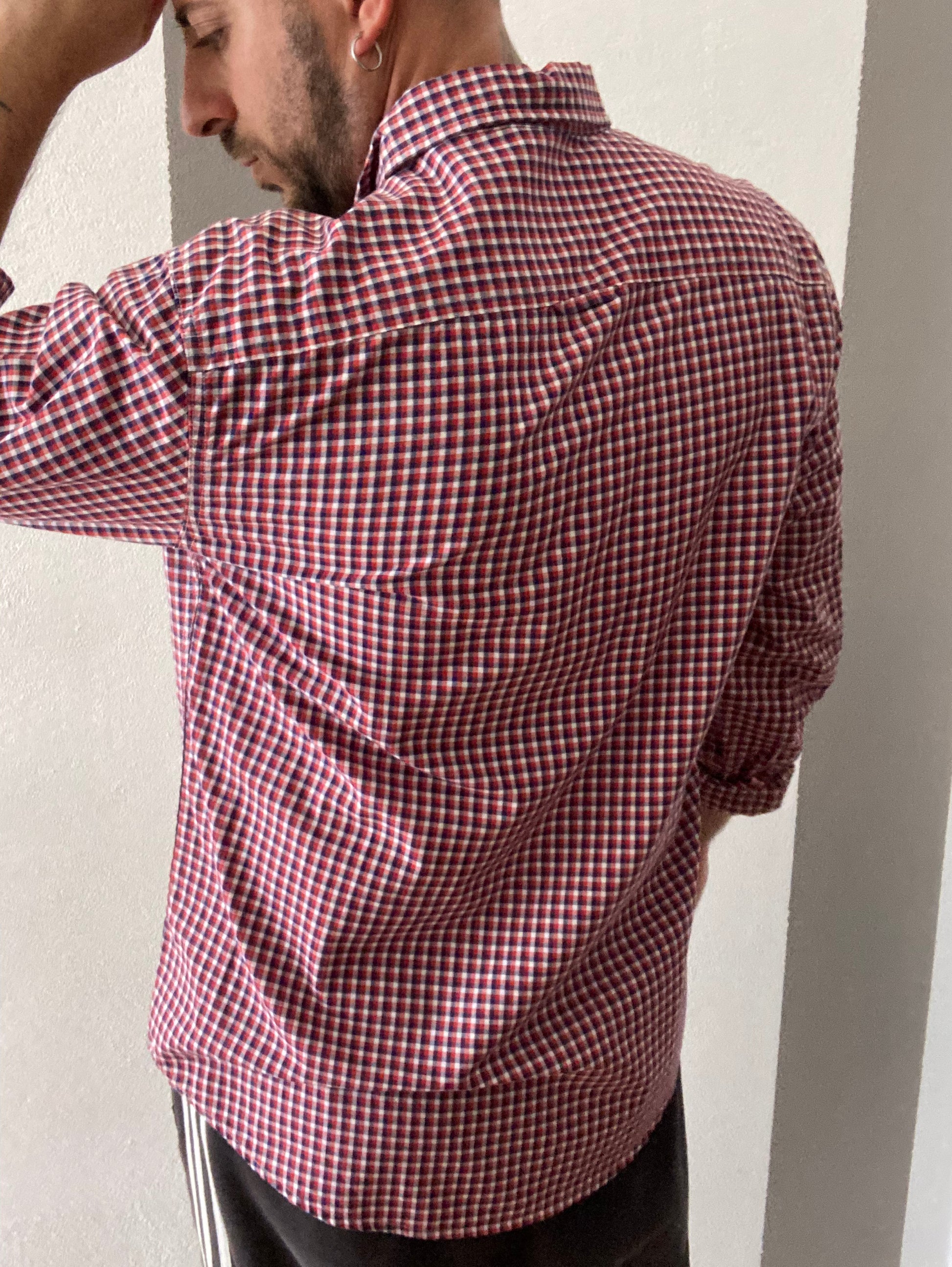 Camicia custom , trama a quadretti con patch palazzi in bianco e grigio , veste una M .