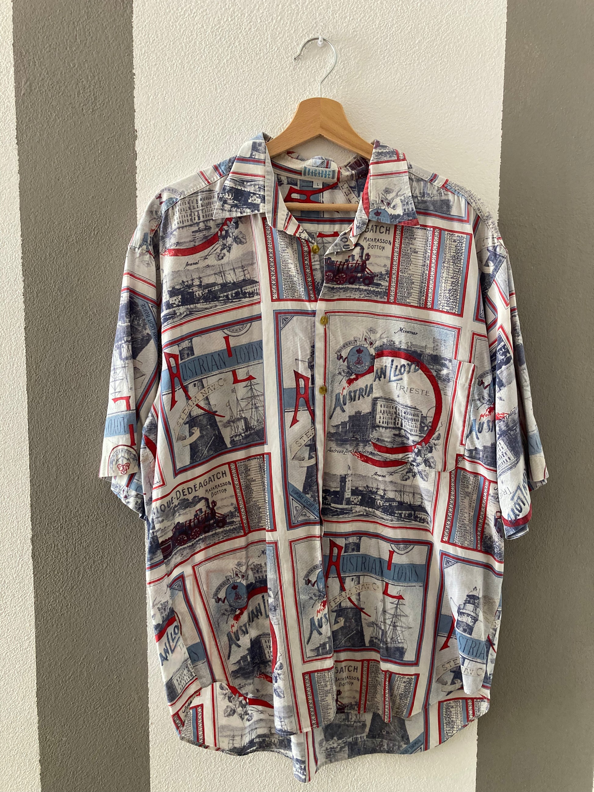 Camicia vintage a fantasia , size L , presenta delle piccole macchioline, il capo è stato lavato più volte per garantire la vendita .