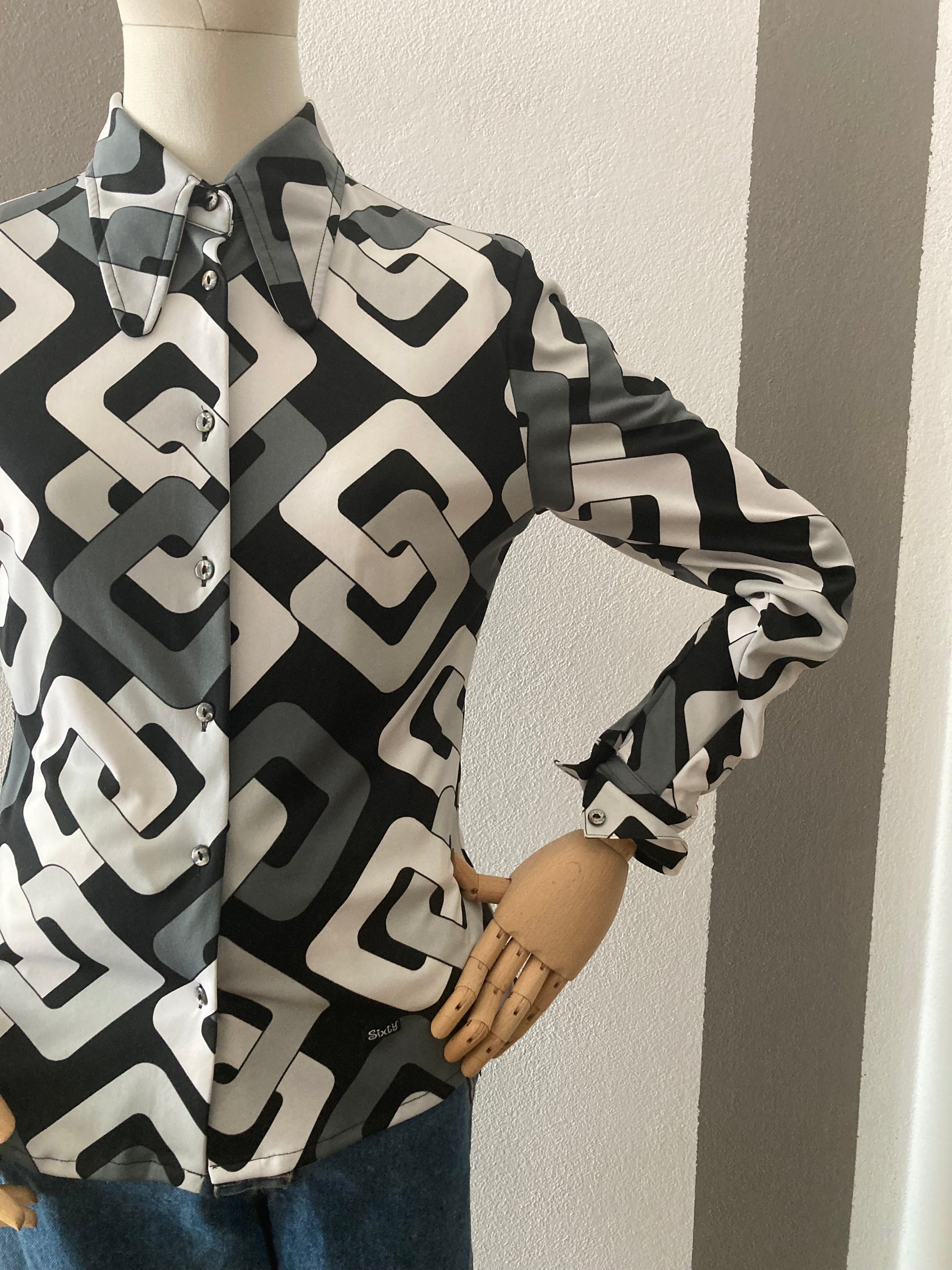 Camicia vintage Sixty, pattern optical in multicolor , colletto a V , riporta una tg L ma veste una M stretta .