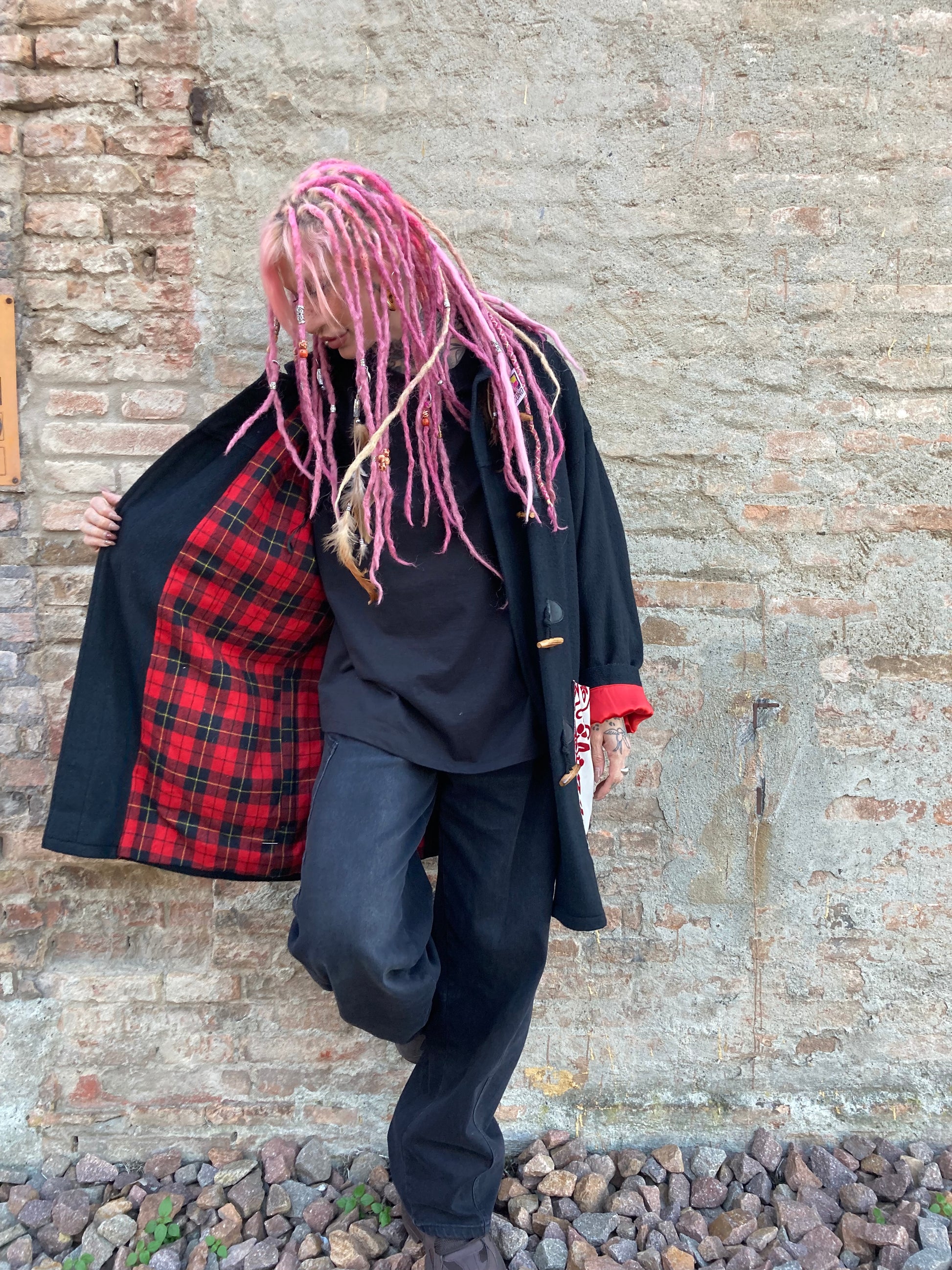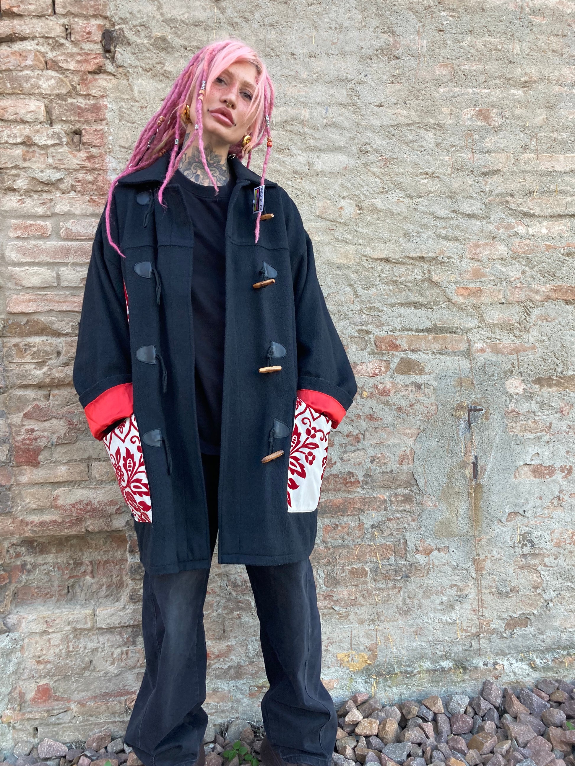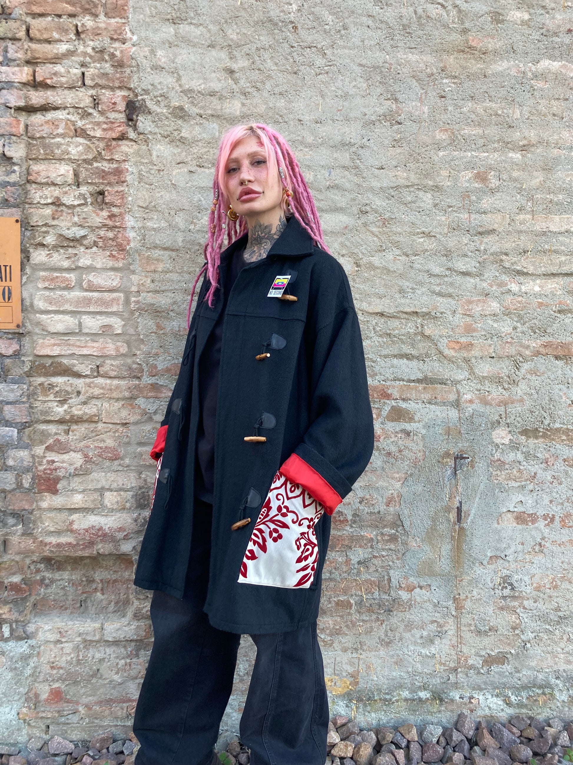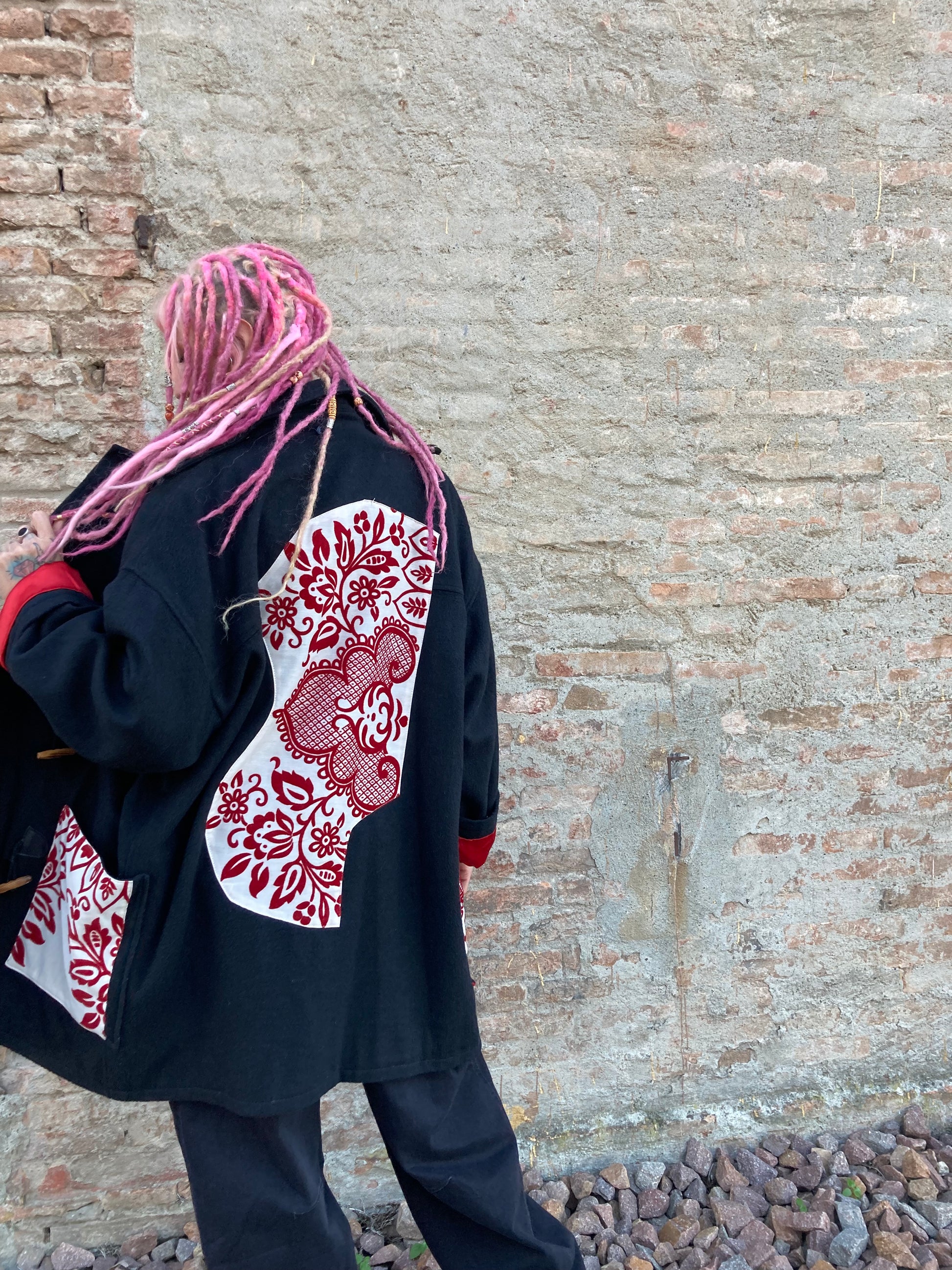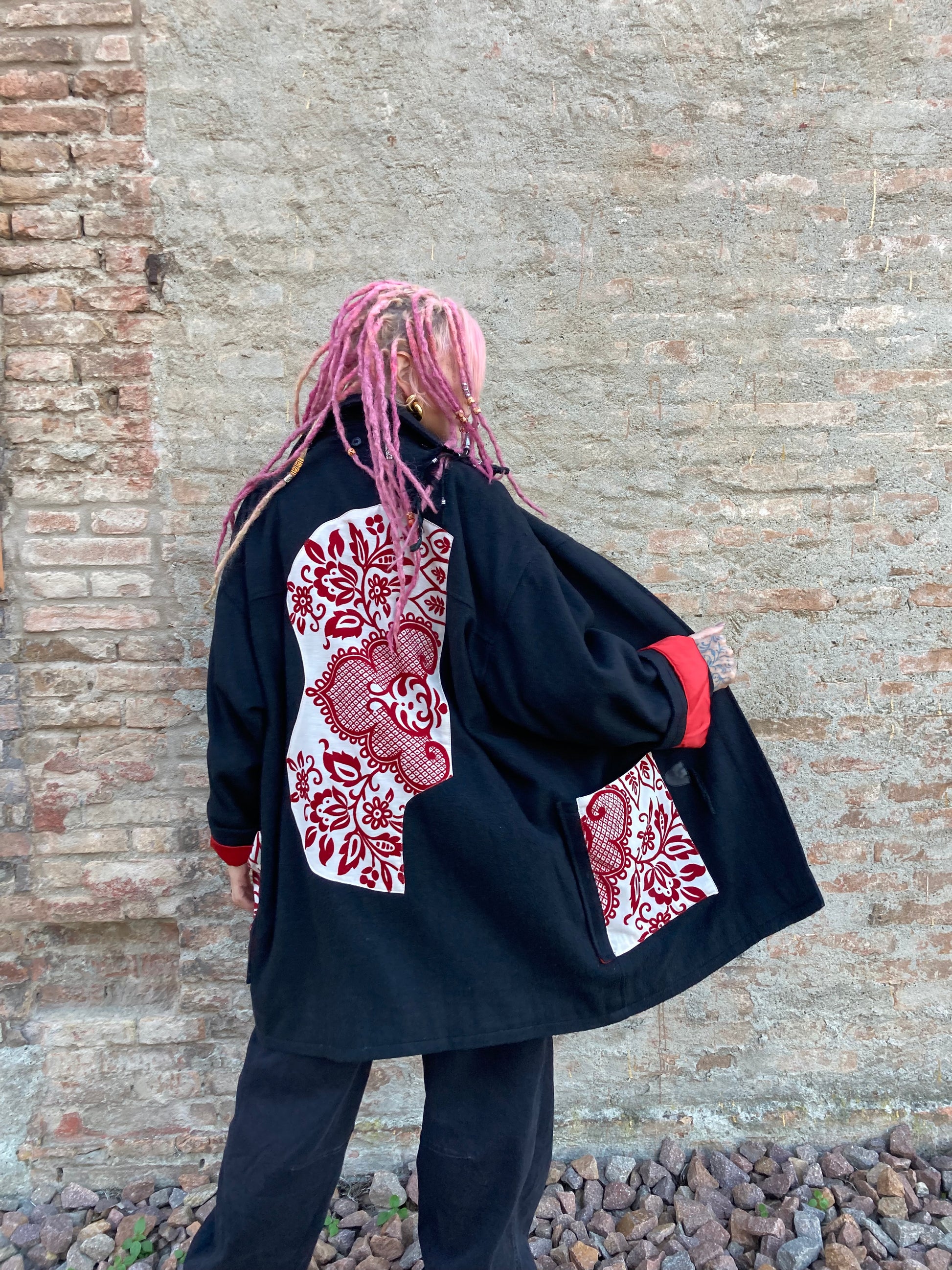 Montgomery vintage collezione macedonia , patch fantasia floreale in rilievo bianco/rosso , veste una L/XLmordida , ampia manica , interno in stile tartan sui toni del rosso .