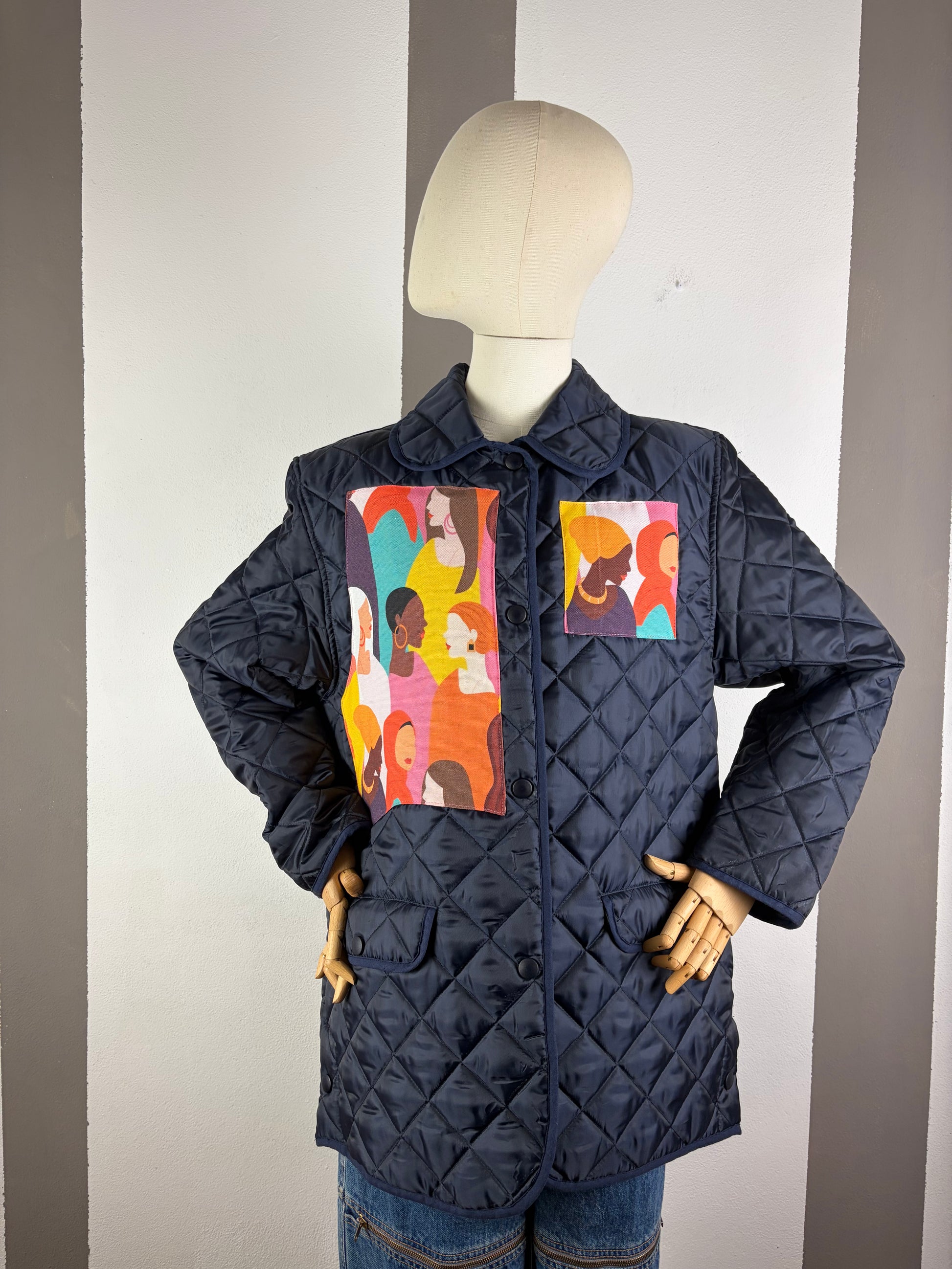 Trapuntino blue con patch in multicolor, veste una m donna .