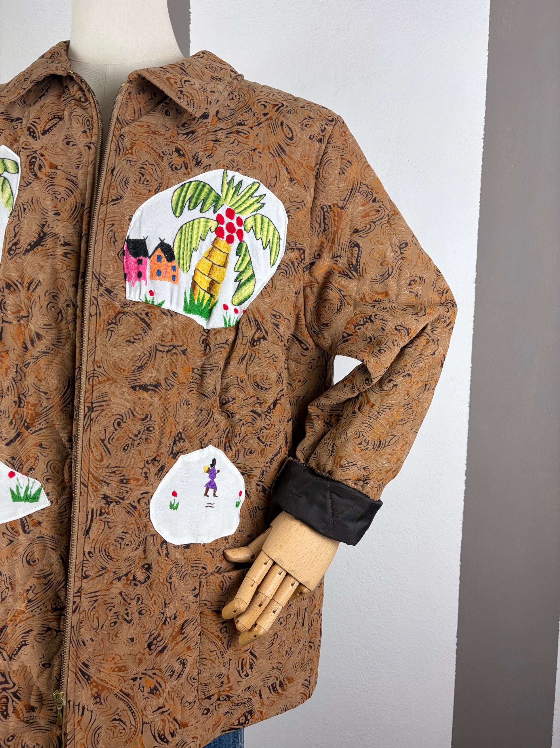 Trapuntino custom Nd con ricami sul davanti e retro , veste una M donna , chiusura sul davanti con zip .