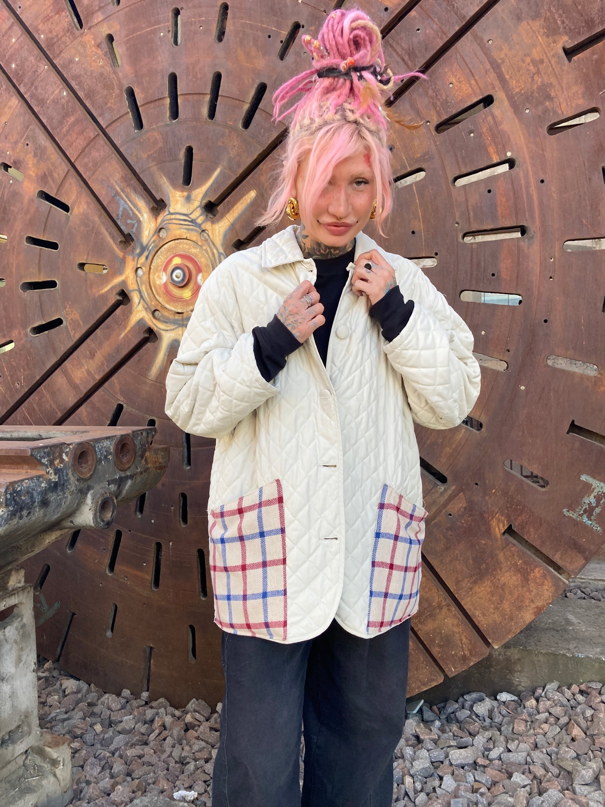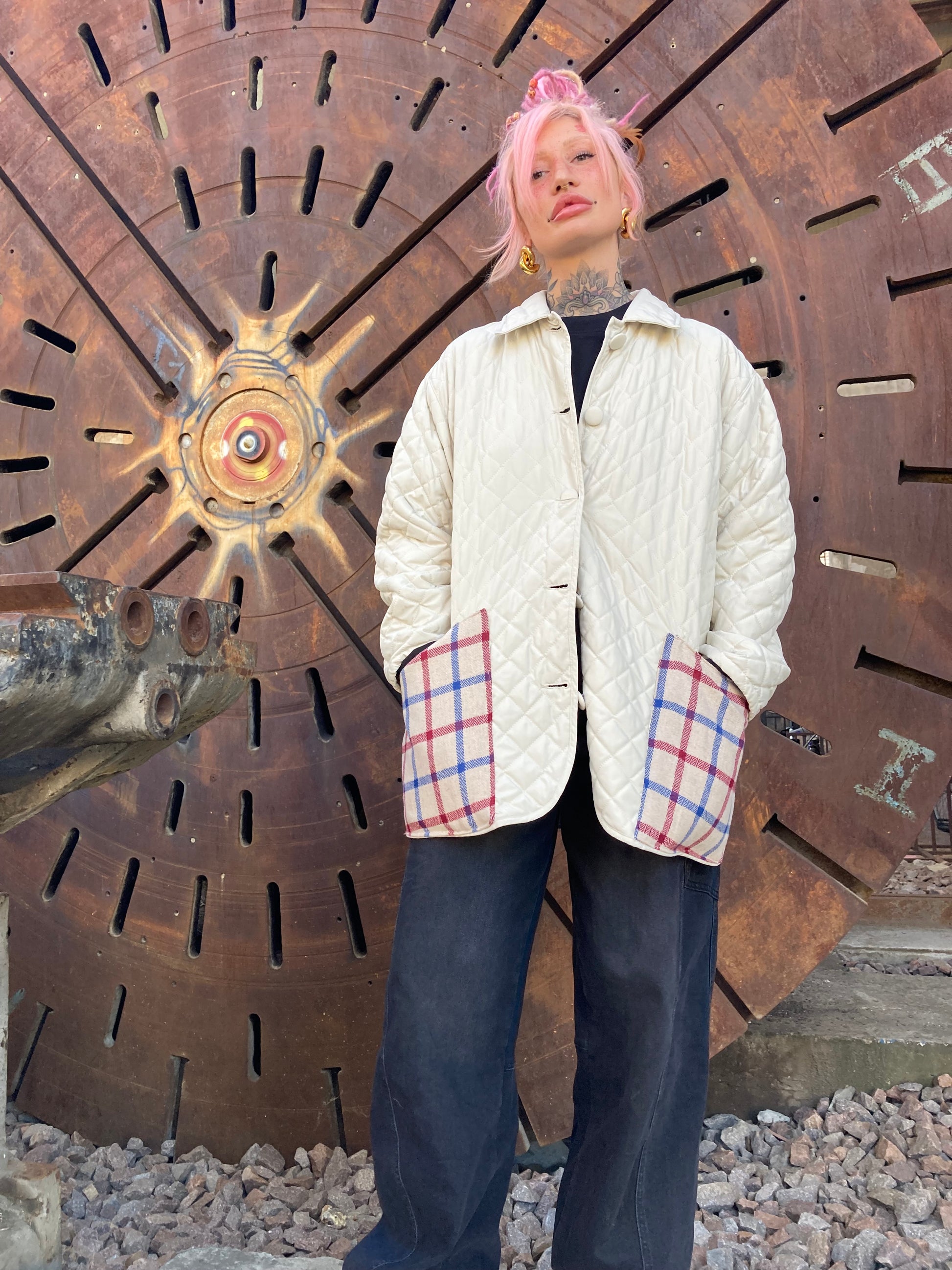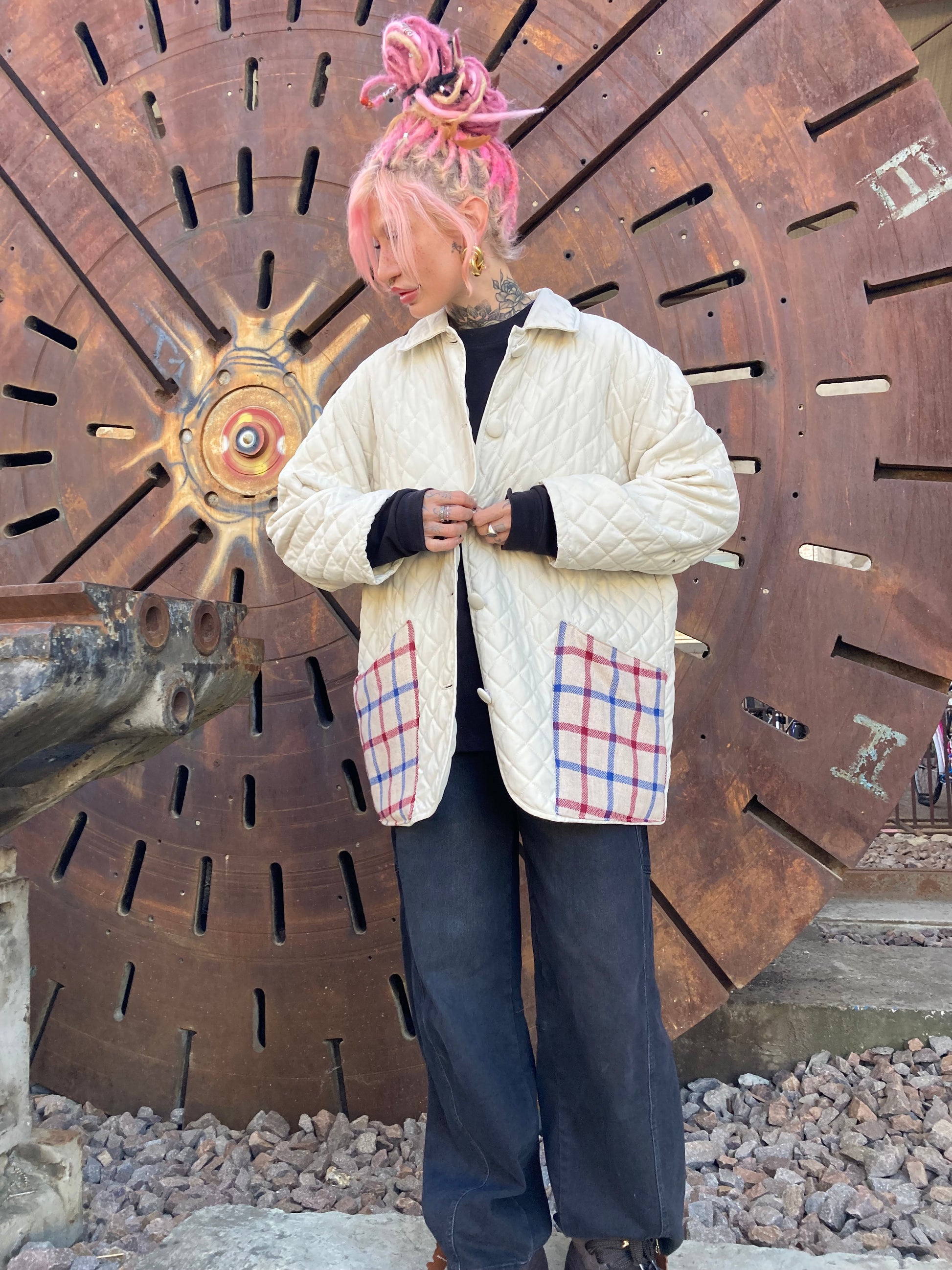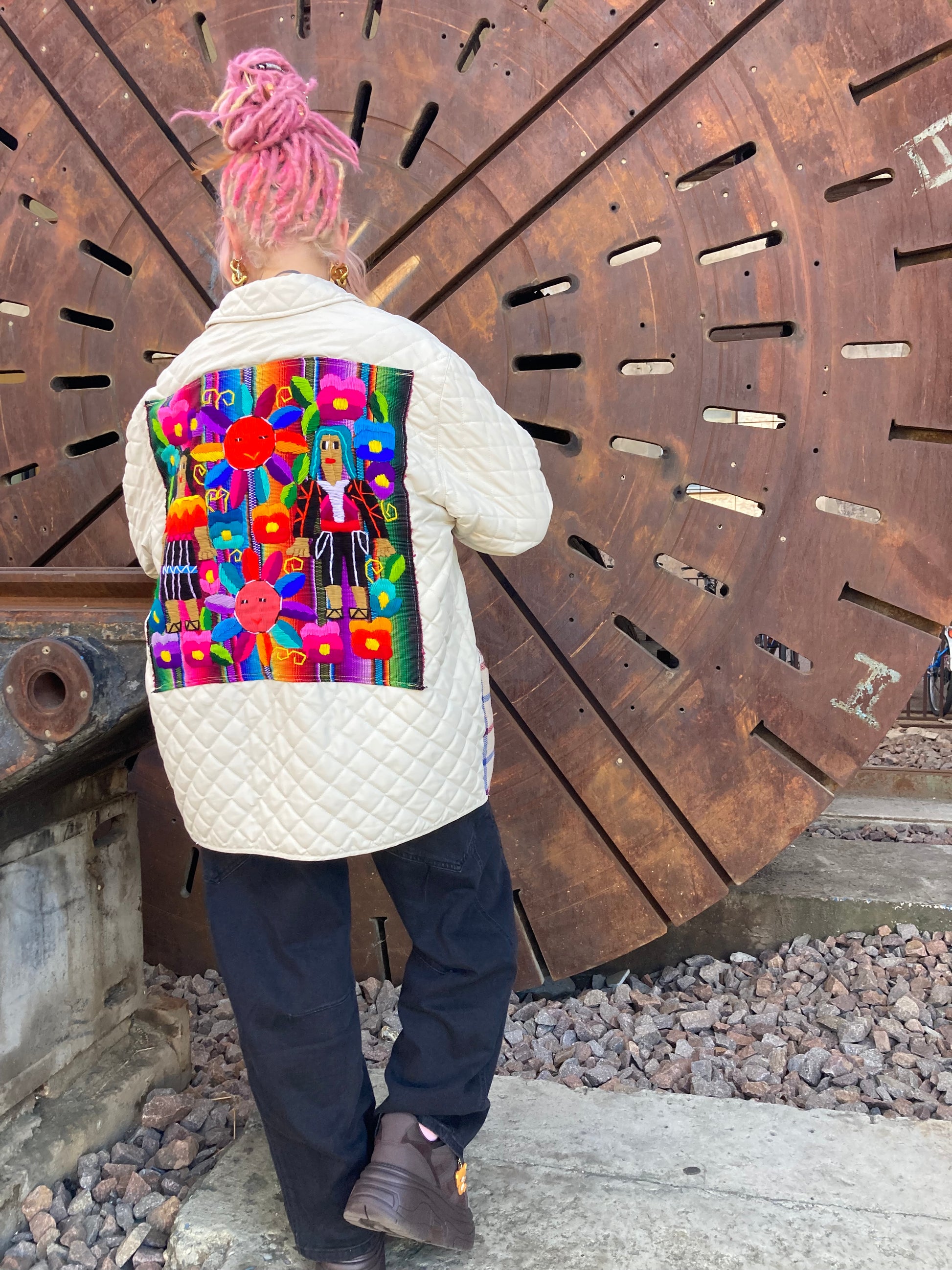 TRAPUNTINO COLLEZIONE MACEDONIA COLOR BIANCO CON PATCH A QUARI SUL DAVANTI , RETRO PATCH RICAMATA IN MULTICOLOR MOLTO BELLA , VESTE UNA L DONNA.