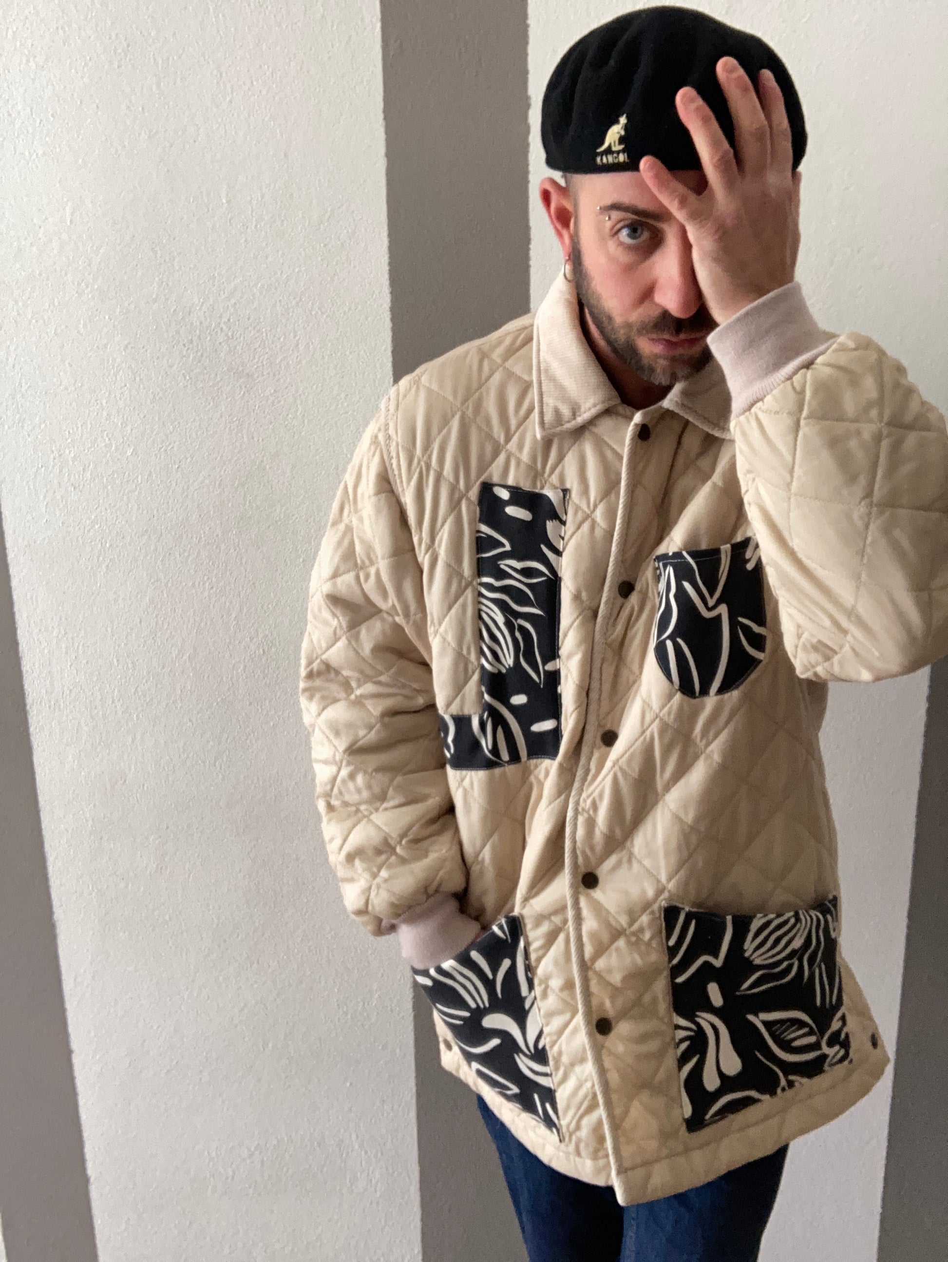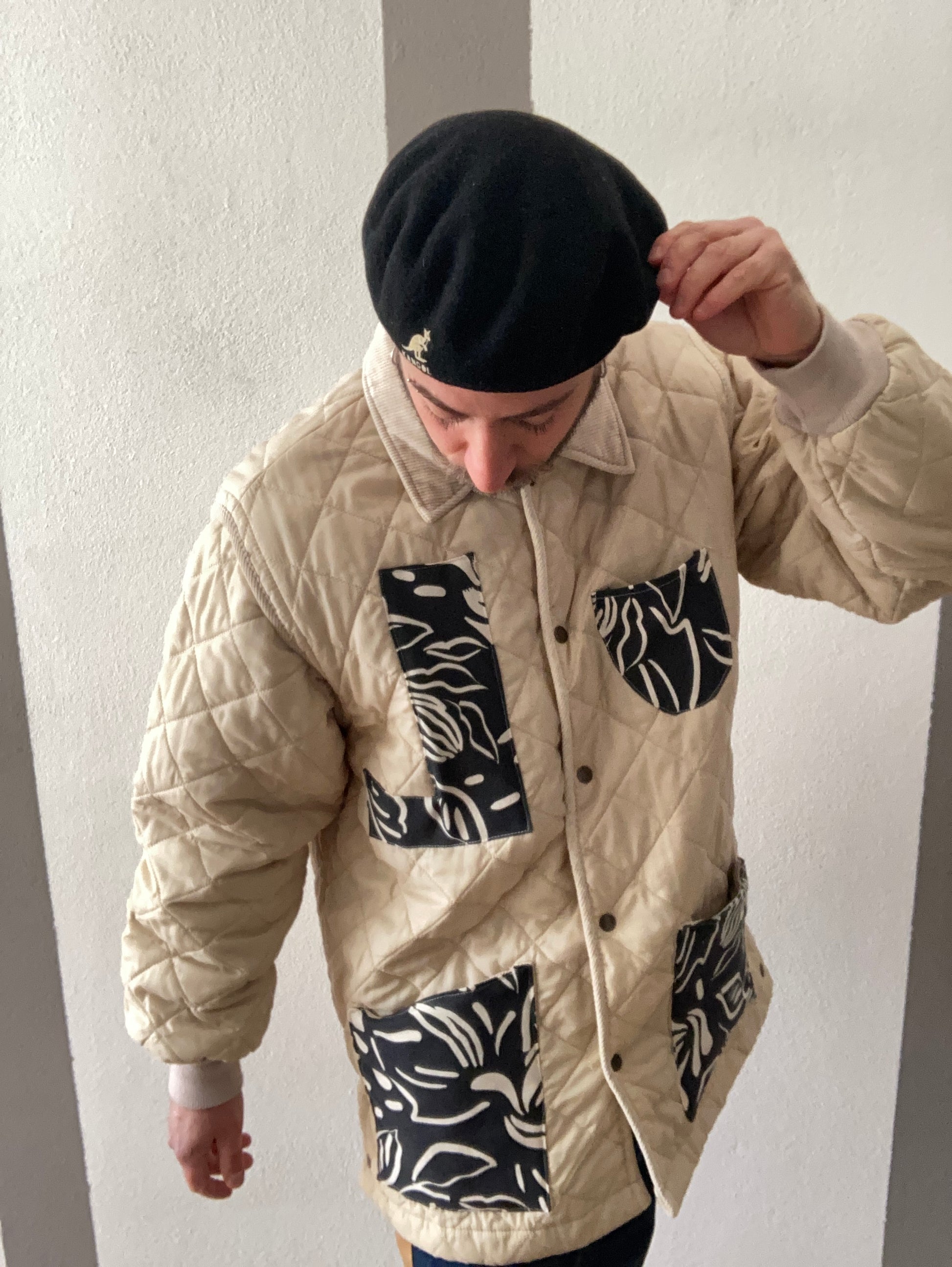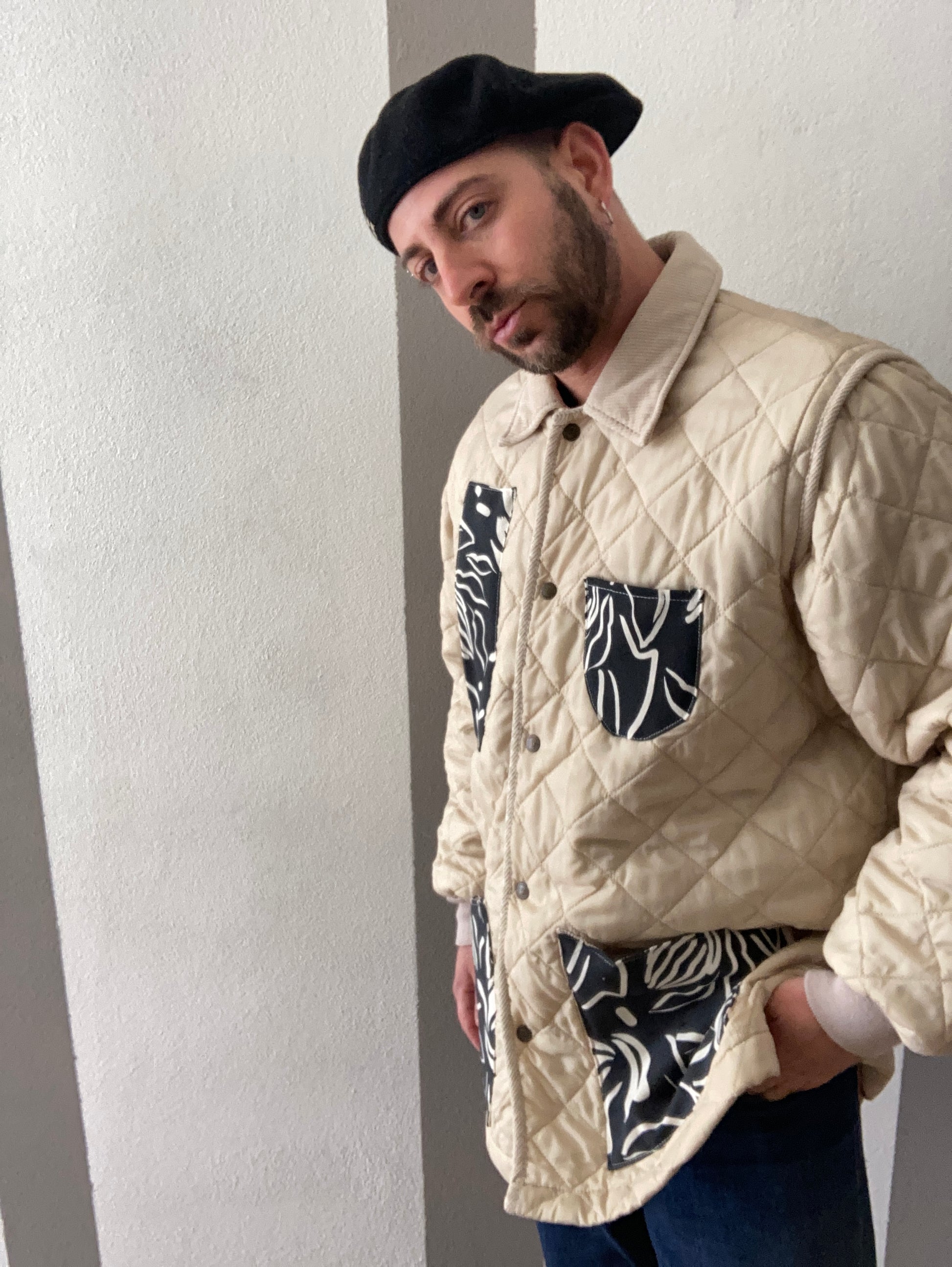 Trapuntino custom color panna collezione macedonia , inserti bianco/ nero a fantasia astratta, veste una M .