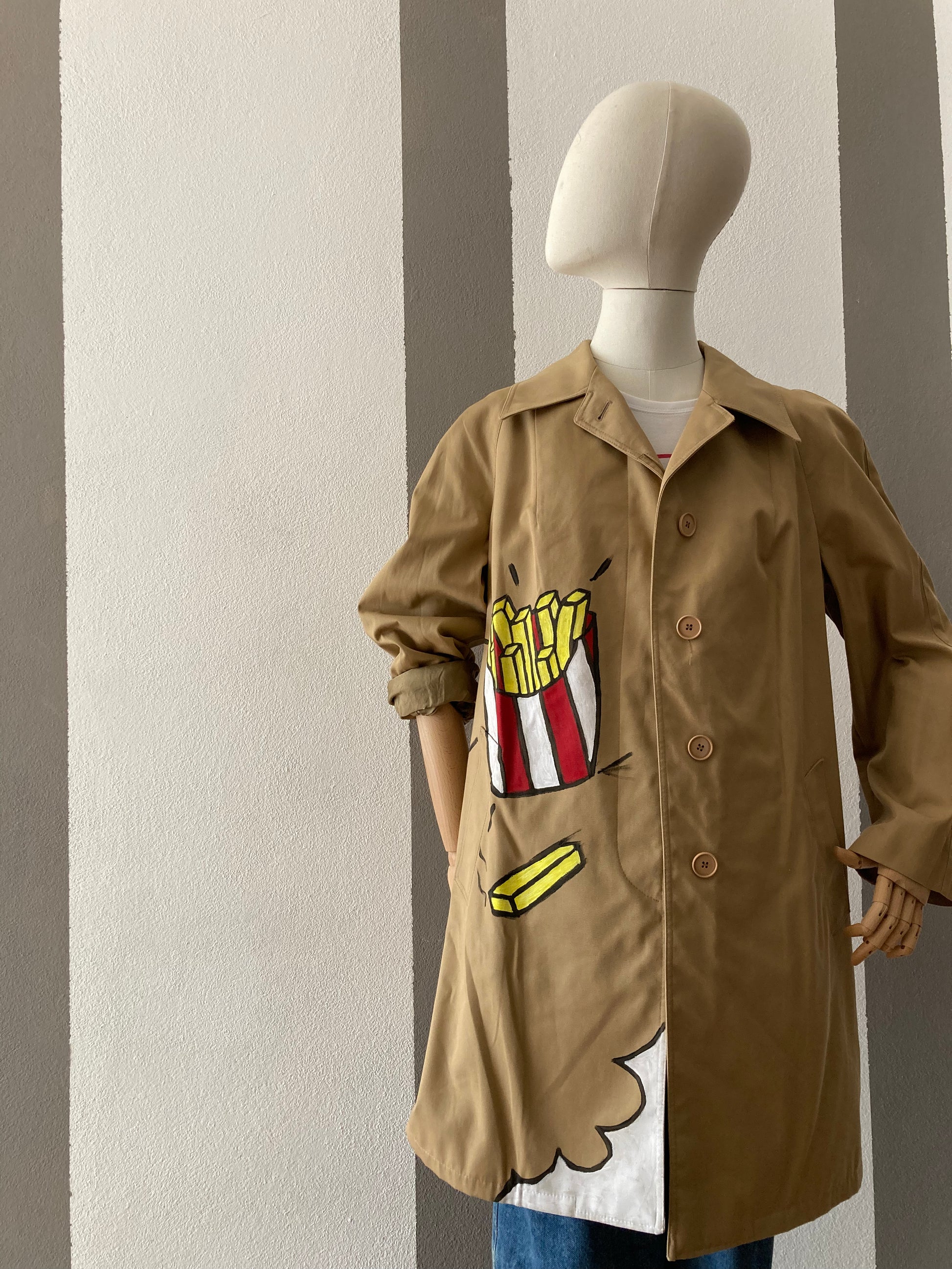 Trench custom french fries + pop corn 🍿, dipinti a mano con acrilico per tessuti ( resistenti ai lavaggi ) , veste una M , color beige, manica raglan . Modello leggermente scampanato.