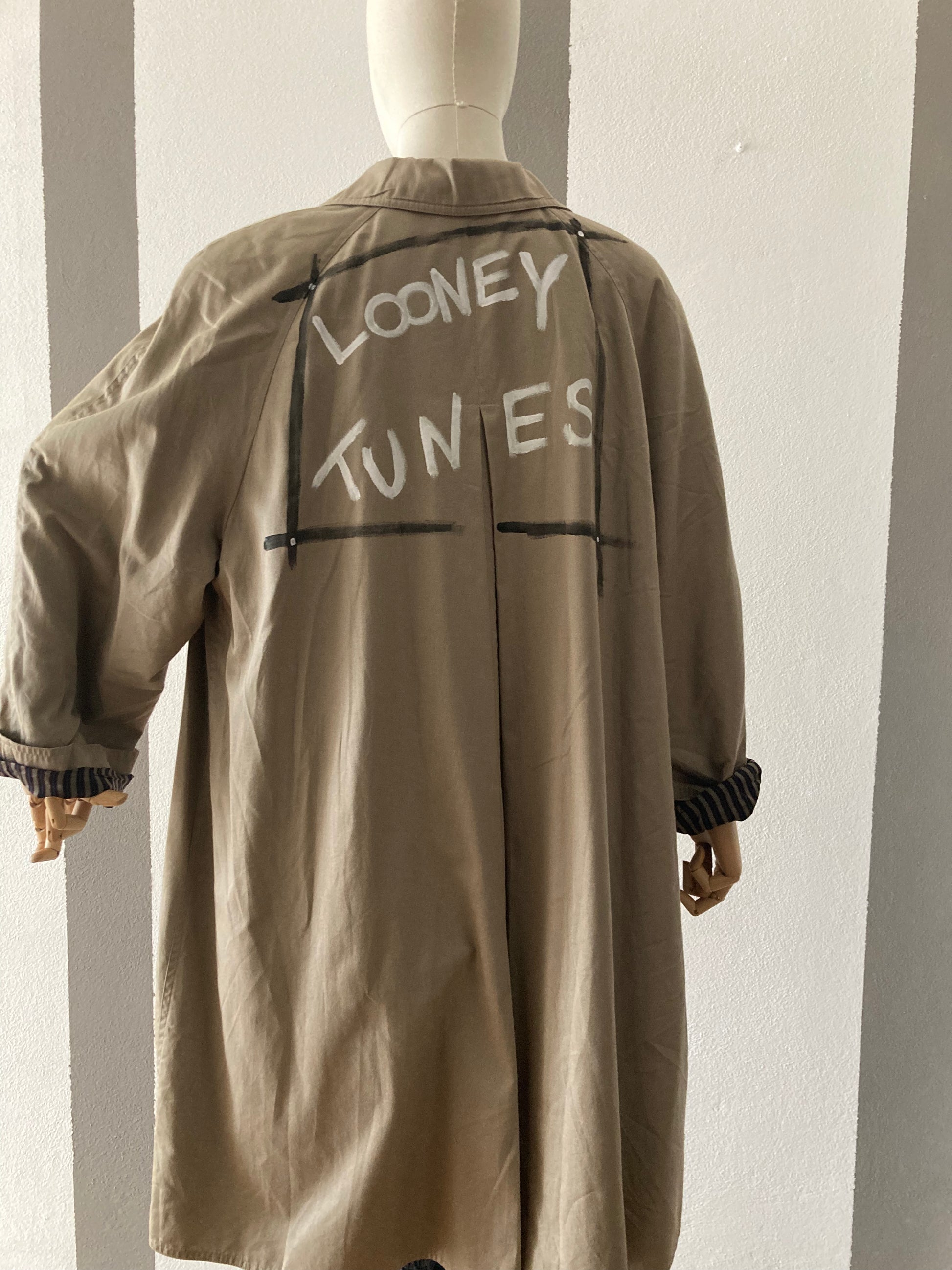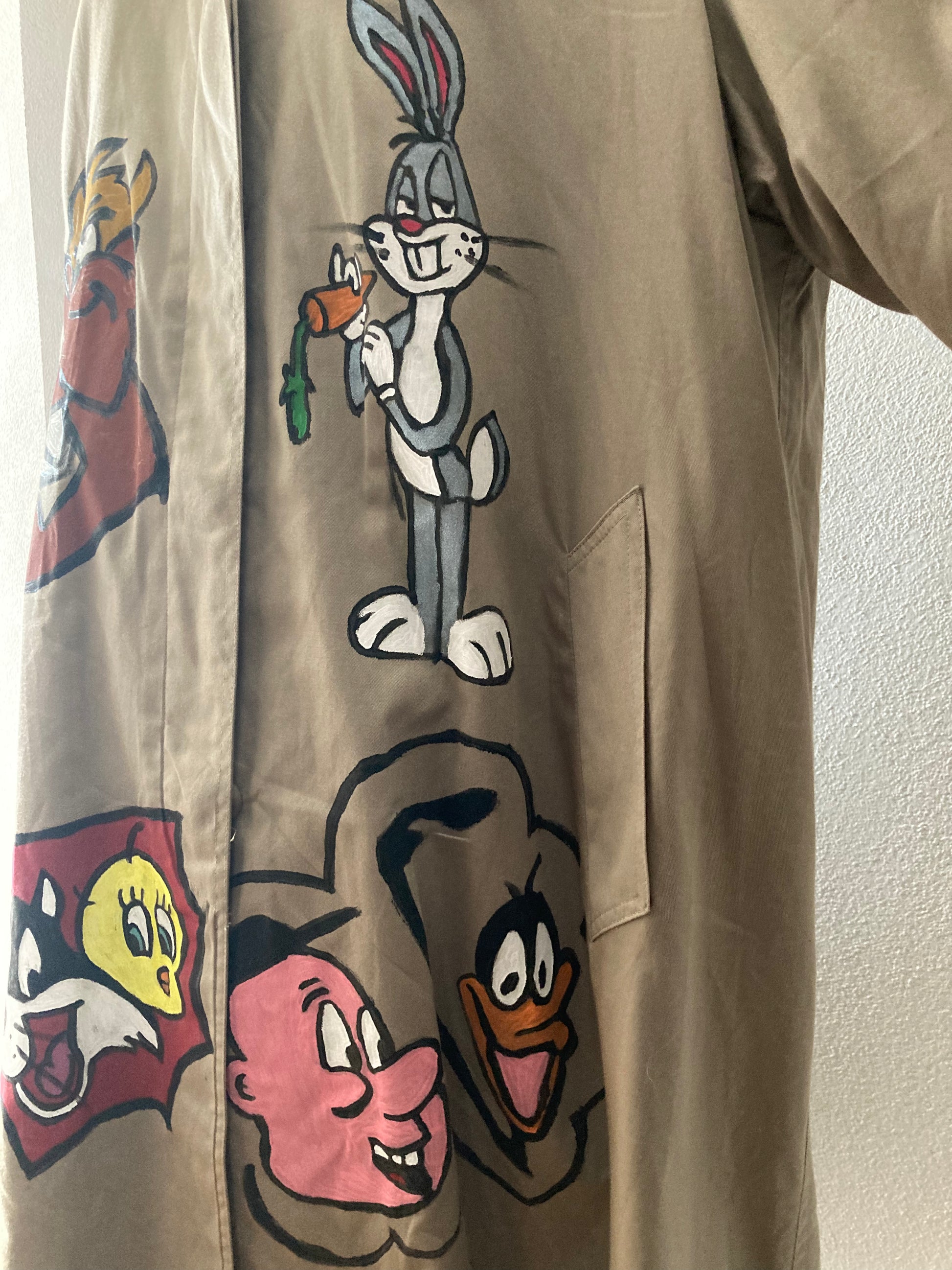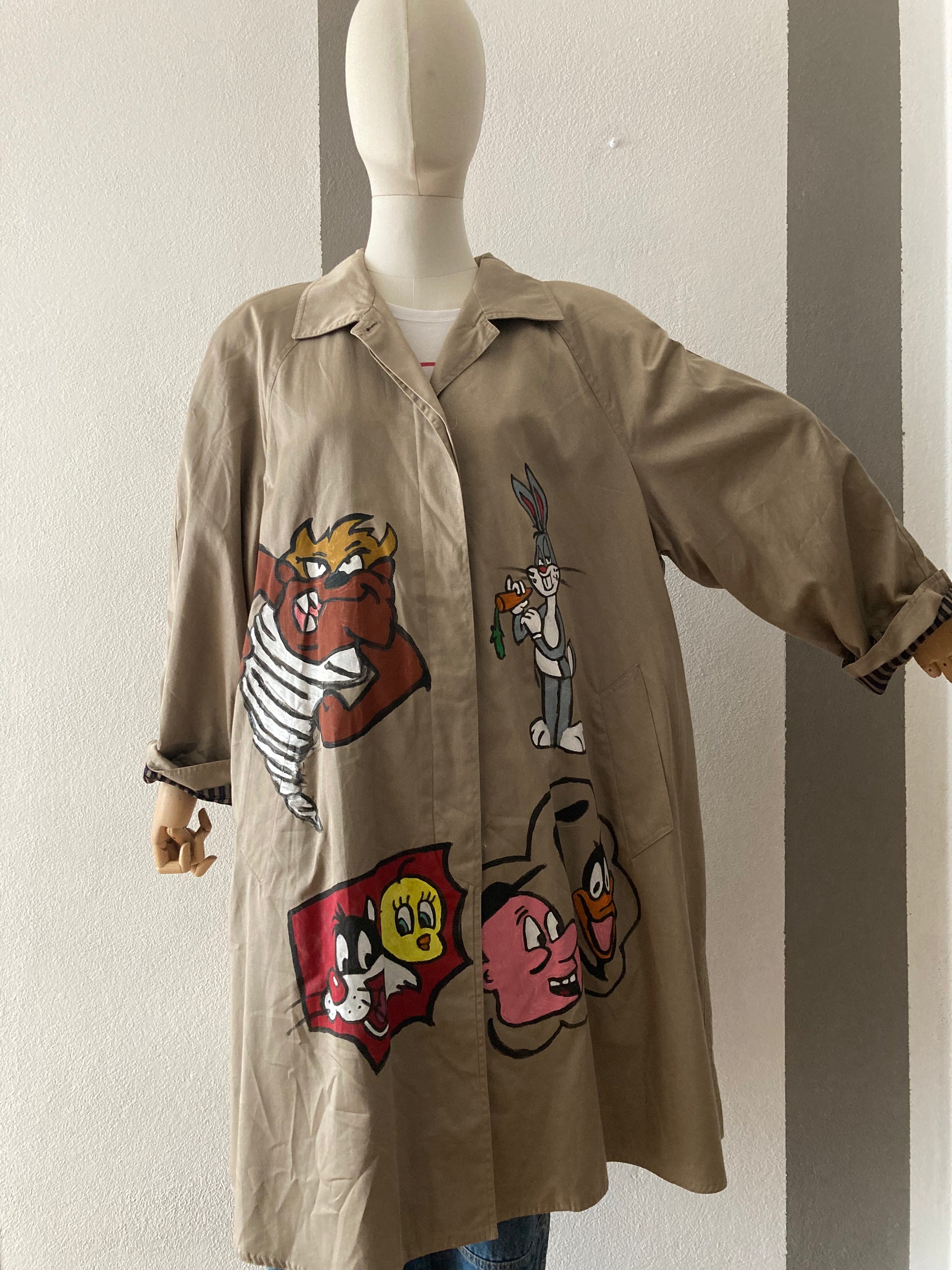 Trench custom Looney Tunes, dipinto a mano mediante utilizzo di acrilico per tessuti ( resistenti ai lavaggi ) , veste una M /L , fodera interna a righe .